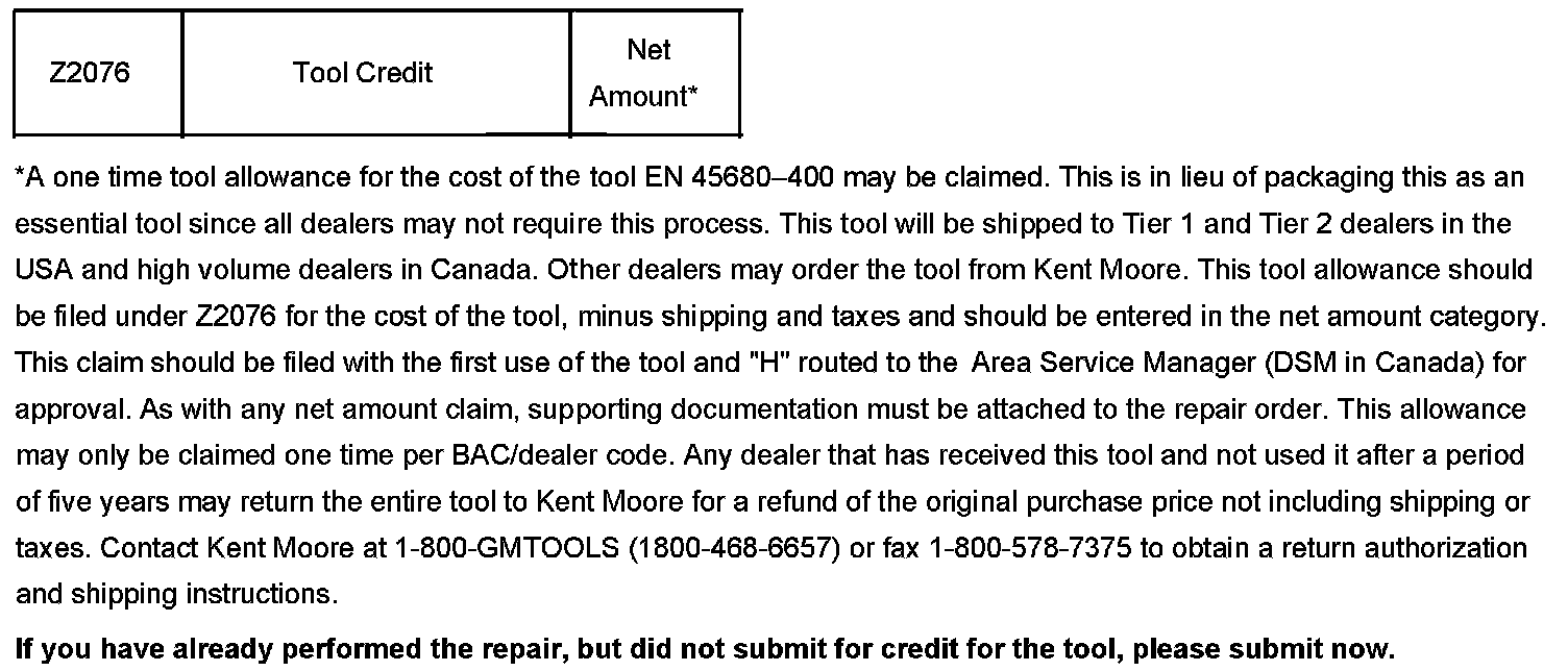 An updated trimmer pilot (EN-45680-499) was sent in November, 2004 to affected Chevrolet and GMC dealers. The new pilot is white in color, and should be installed on EN-45680-411 Trim Tool Assembly. Buick and HUMMER dealers were sent EN-45680-400 Cylinder Liner Replacer kit with the correct pilot already installed. Inspect EN-45680-411 to ensure the correct white pilot is installed.