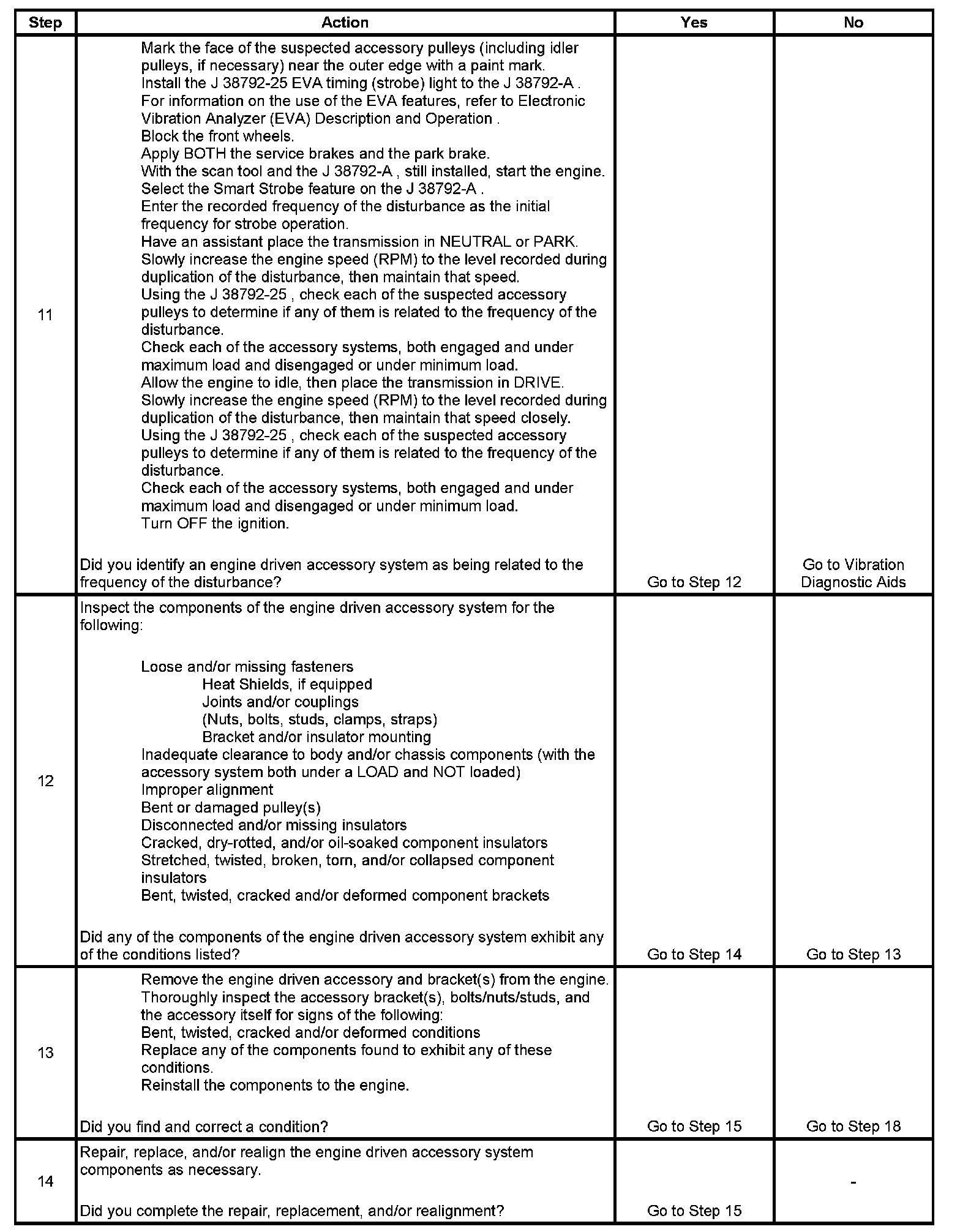 10. Non-rotating engine driven accessory components can no longer produce a unique disturbance. If a disturbance is still present, but the characteristics have been altered, it is possible that these component systems are acting as a transfer path for engine firing frequency or a first order engine disturbance.