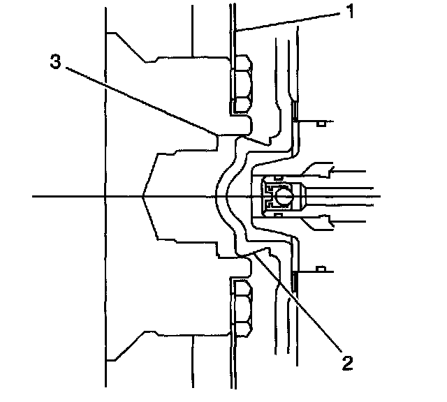 3. Align the torque converter hub (2) in the engine crankshaft (3) and install the torque converter to flywheel bolts.