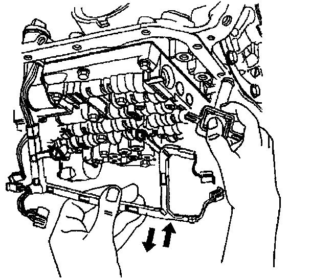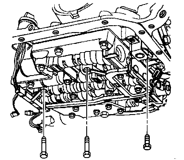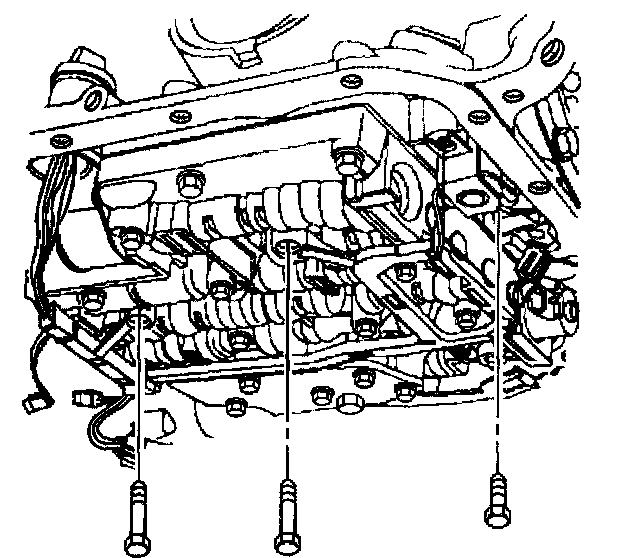 10. Remove the TCC solenoid retaining bolts and the valve body bolts which retain the internal wiring harness.