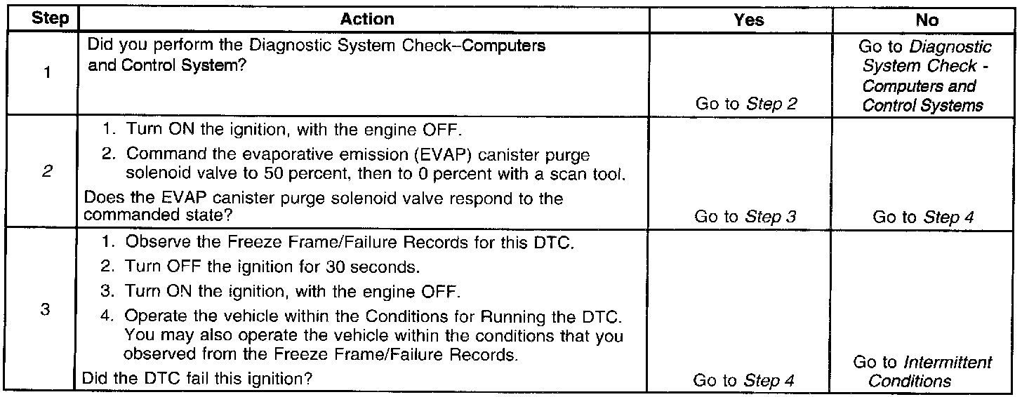 An ignition voltage is supplied directly to the evaporative emission (EVAP) canister purge solenoid valve. The EVAP canister purge solenoid valve is pulse width modulated (PWM). The scan tool displays the amount of ON time as a percentage. The control module monitors the status of the driver. The control module controls the EVAP canister purge solenoid valve ON time by grounding the control circuit via an internal switch called a driver. If the control module detects an incorrect voltage for the commanded state of the driver, this DTC sets.