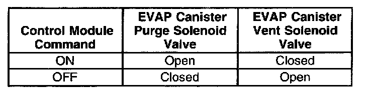 The table illustrates the relationship between the ON and OFF states, and the Open or Closed states of the EVAP canister purge and vent solenoid valves.