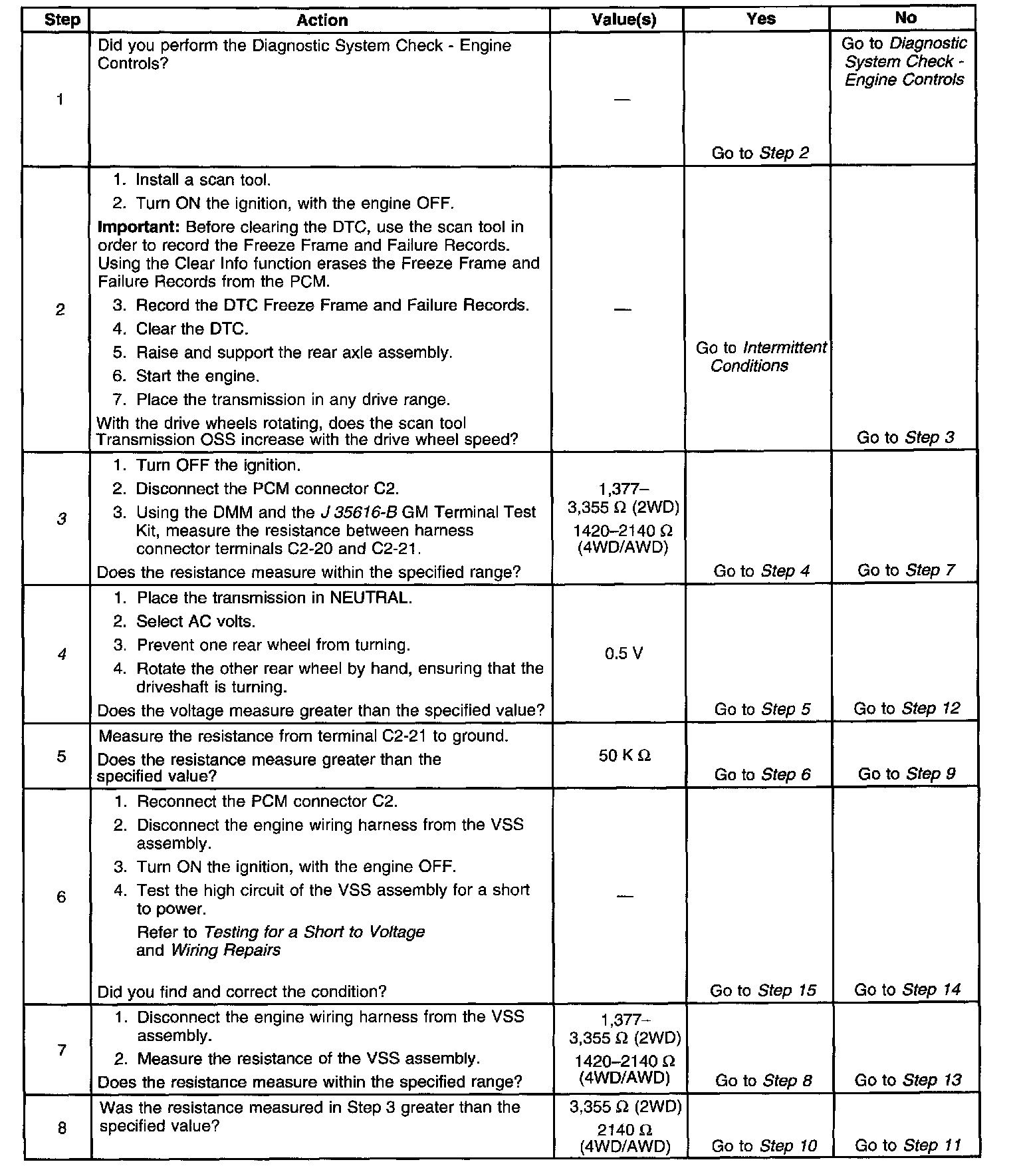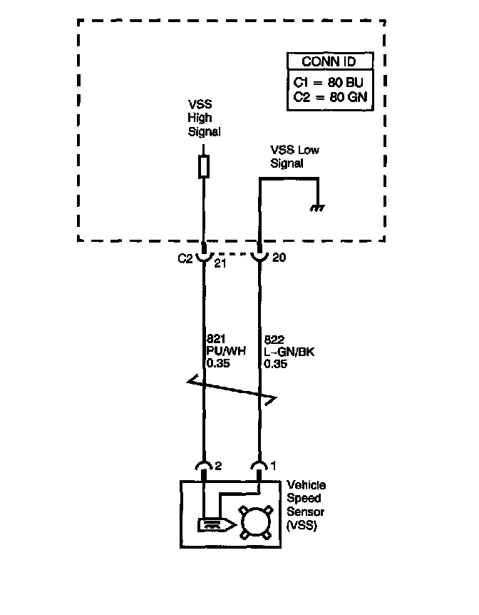 The Vehicle Speed Sensor (VSS) assembly provides vehicle speed information to the Powertrain Control Module (PCM). The VSS assembly is a permanent magnet generator. The VSS produces an AC voltage as rotor teeth on the output shaft of the transmission, 2WD, or transfer case, 4WD/AWD, pass through the sensor's magnetic field. The AC voltage level and the number of pulses increase as the speed of the vehicle increases. The PCM converts the pulsing voltage to vehicle speed. The PCM uses the vehicle speed signal to determine shift timing and Torque Converter Clutch (TCC) scheduling.
