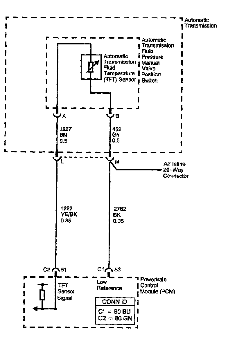 The automatic Transmission Fluid Temperature (TFT) sensor is part of the automatic Transmission Fluid Pressure (TFP) manual valve position switch. The TFT sensor is a resistor, or thermistor, which changes value based on temperature. The sensor has a negative-temperature coefficient. This means that as the temperature increases, the resistance decreases, and as the temperature decreases, the resistance increases. The Powertrain Control Module (PCM) supplies a 5-volt reference signal to the sensor on the TFT sensor signal circuit and measures the voltage drop in the circuit. When the transmission fluid is cold, the sensor resistance is high and the PCM detects high signal voltage. As the fluid temperature warms to a normal operating temperature, the resistance becomes less and the signal voltage decreases. The PCM uses this information to control shift quality and torque converter clutch apply.