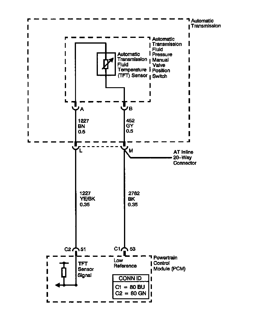 The automatic Transmission Fluid Temperature (TFT) sensor is part of the automatic Transmission Fluid Pressure (TFP) manual valve position switch. The TFT sensor is a resistor, or thermistor' which changes value based on temperature. The sensor has a negative-temperature coefficient. This means that as the temperature increases, the resistance decreases, and as the temperature decreases, the resistance increases. The Powertrain Control Module (PCM) supplies a 5-volt reference signal to the sensor on the TFT sensor signal circuit and measures the voltage drop in the circuit. When the transmission fluid is cold, the sensor resistance is high and the PCM detects high signal voltage. As the fluid temperature warms to a normal operating temperature, the resistance becomes less and the signal voltage decreases. The PCM uses this information to control shift quality and torque converter clutch apply.