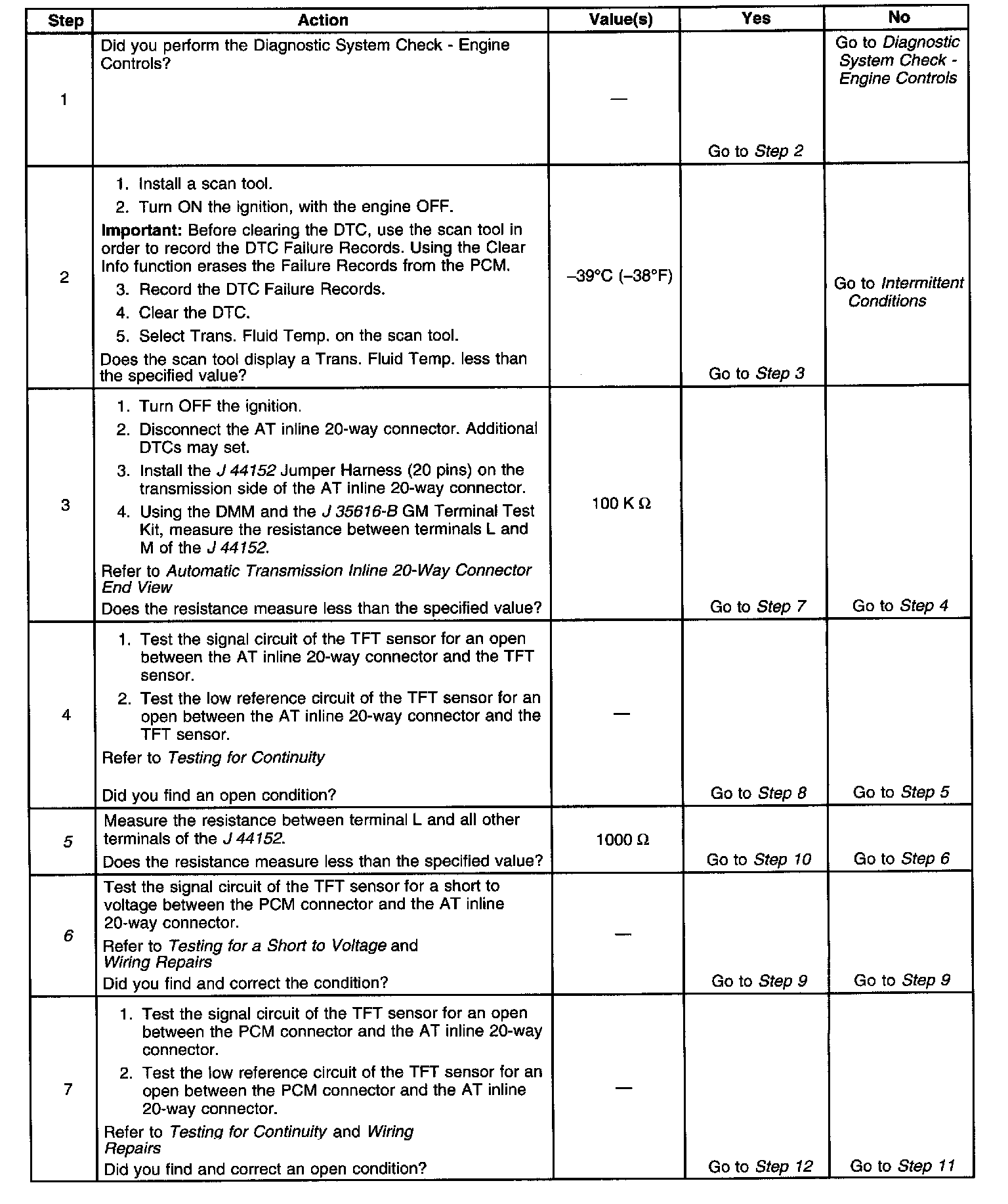 5. This step tests the TFT sensor signal circuit for being shorted to another circuit within the transmission. If the TFT sensor signal circuit shorts to another circuit, which is carrying voltage greater than five volts, the TFT sensor would become open.