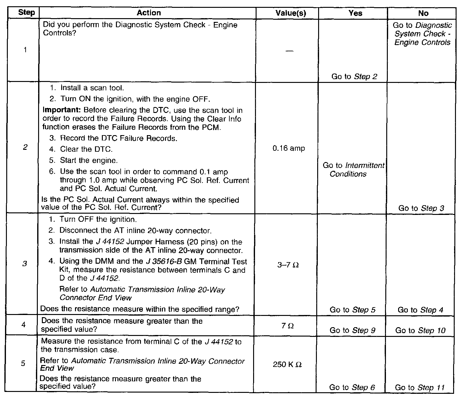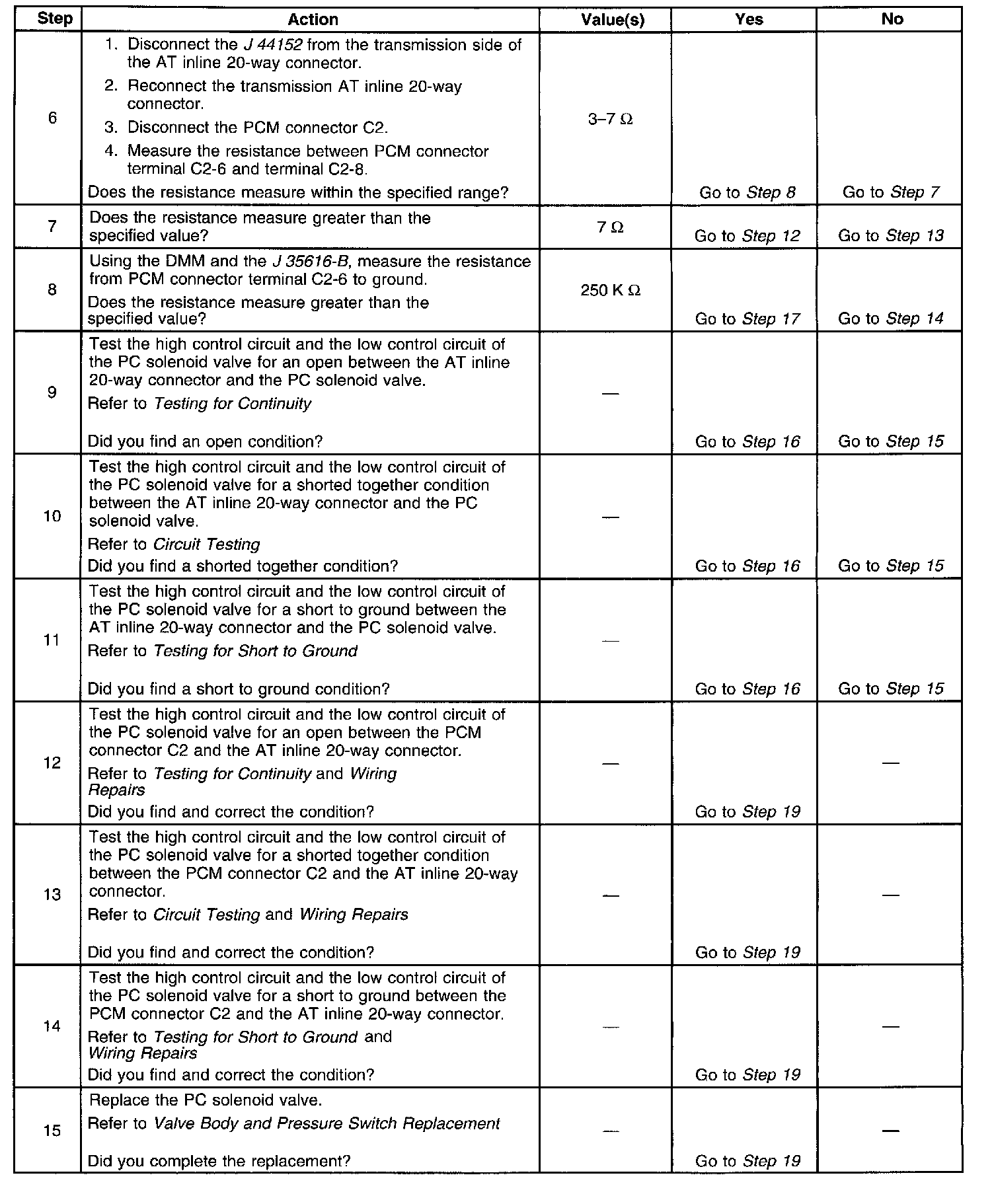 3. This step tests the PC solenoid valve and automatic transmission wiring harness assembly for incorrect resistance.