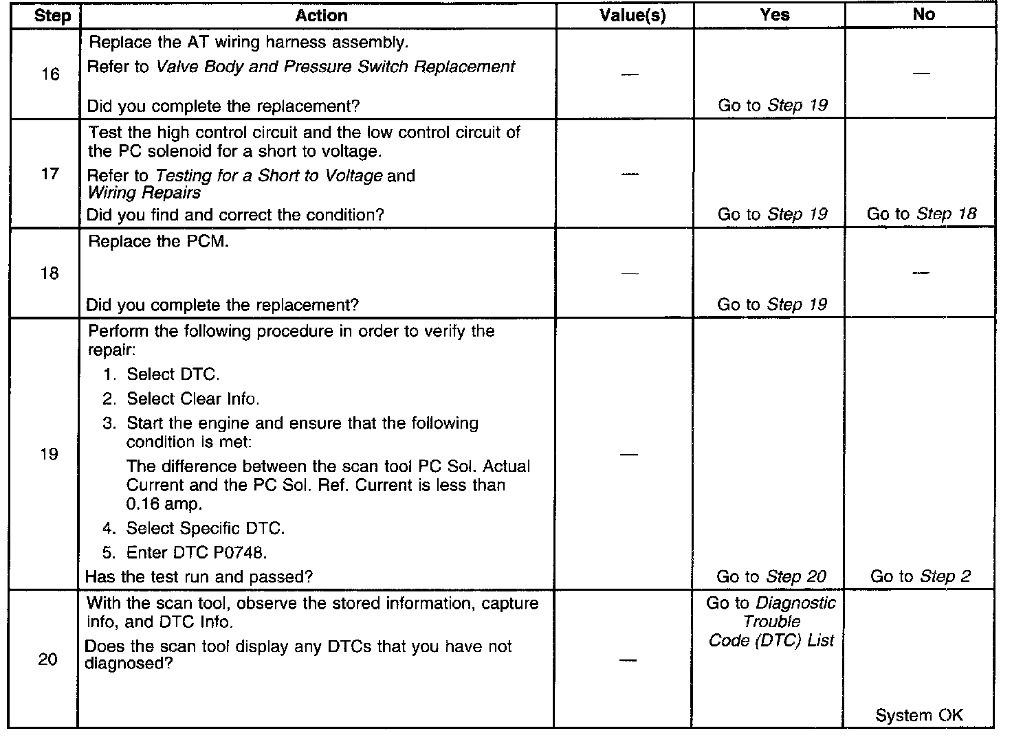 When the PCM detects a continuous open or short in the PC solenoid valve circuit, then DTC P0748 sets. DTC P0748 is a type C DTC.