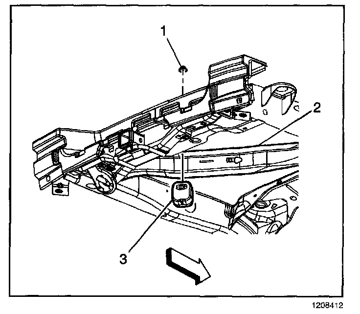 3. Remove the theft deterrent alarm mounting nut (1) from the crossmember support (2).