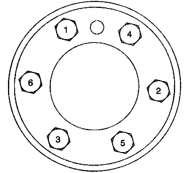 Engine Flywheel InstallationImportant: The flywheel does not use a locating pin for alignment, and will not initially seat against the crankshaft flange, but will be pulled onto the crankshaft by the engine flywheel bolts. This procedure requires a three stage tightening process.