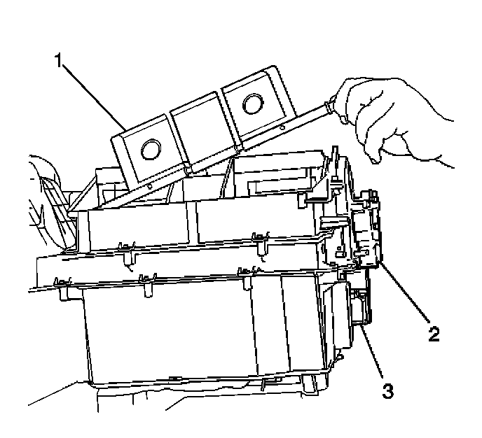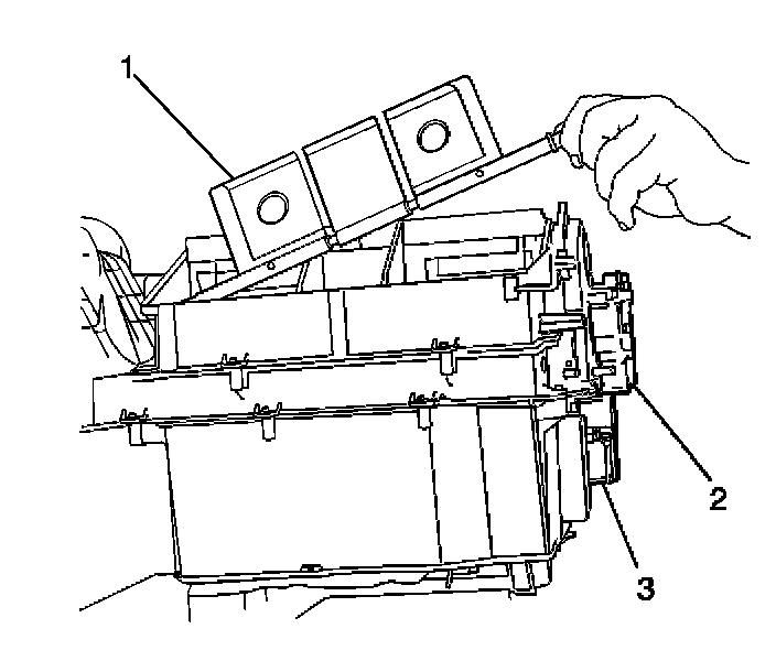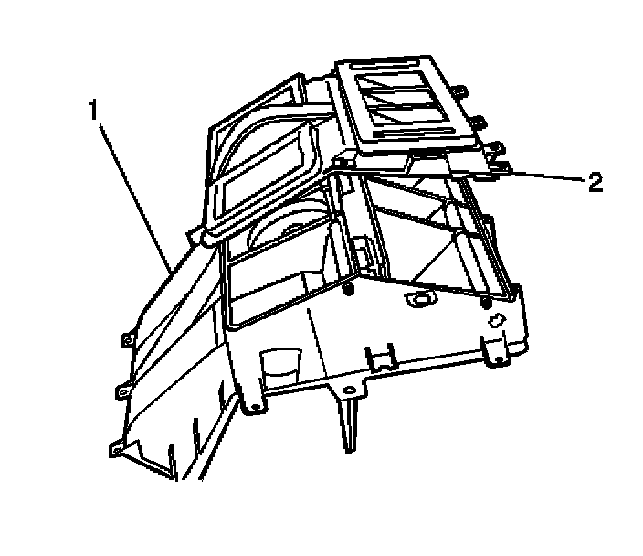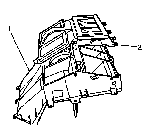 4. Remove screws in order to separate the defroster/mode outlet cover (2) from the HVAC module assembly (1).