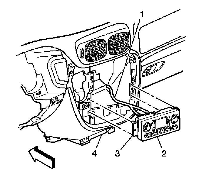 2. Install the HVAC control module (2) to the instrument panel (4), ensuring that the HVAC control module retaining tabs (3) lock into place.