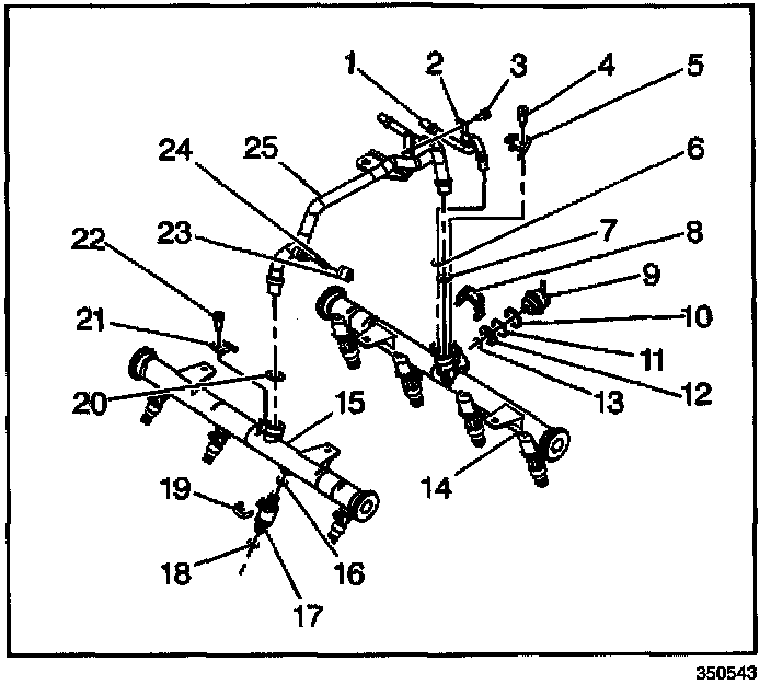 9. Remove the crossover pipe rail assembly (25) from the left hand fuel rail assembly (14) and the right hand rail assembly (15).