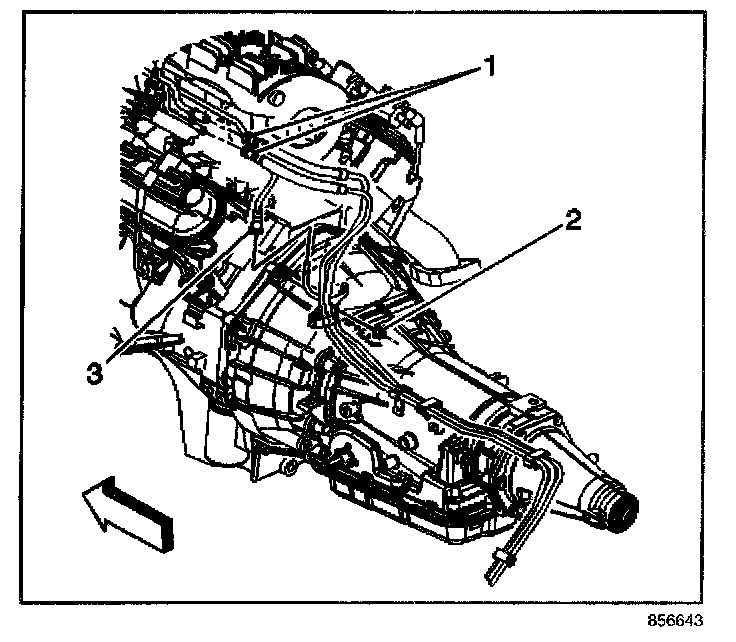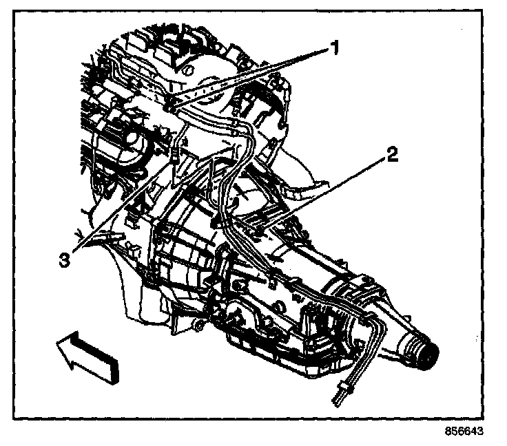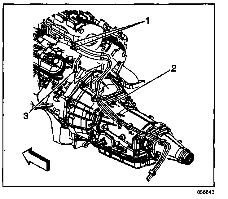 10.1. Install the EVAP/fuel hose/pipe assembly to the retaining clips (1) on the transmission.