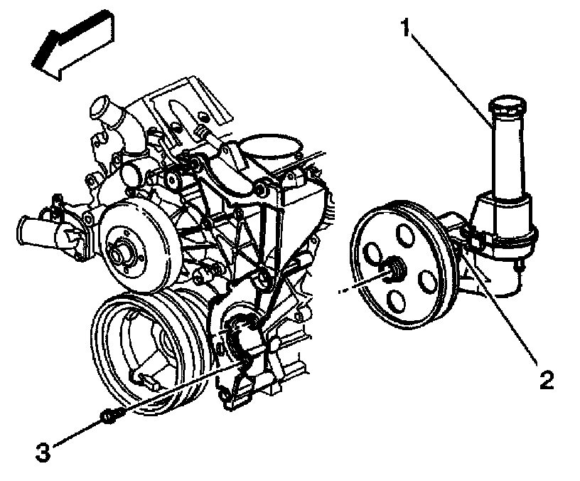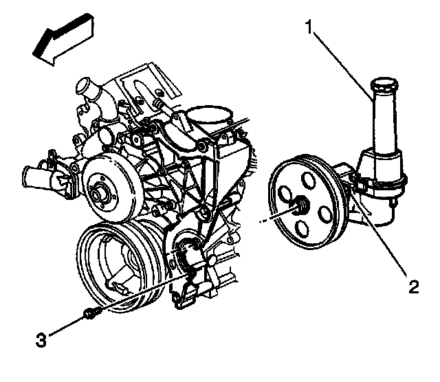 3. Align the power steering pump (1) with mounting bolt holes on engine block (2).