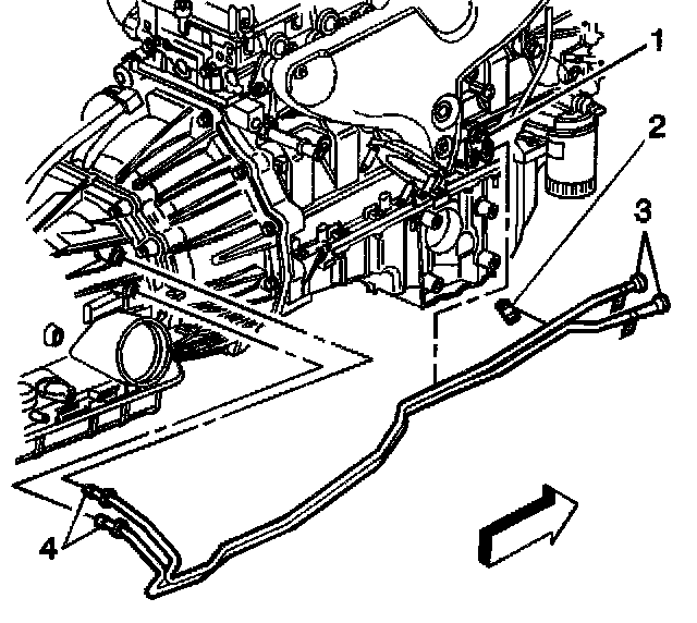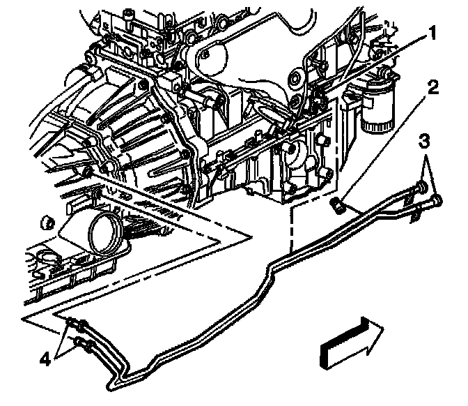 8. Remove the rear sections of the cooler lines from the retainer (1) located on the right side of the engine.