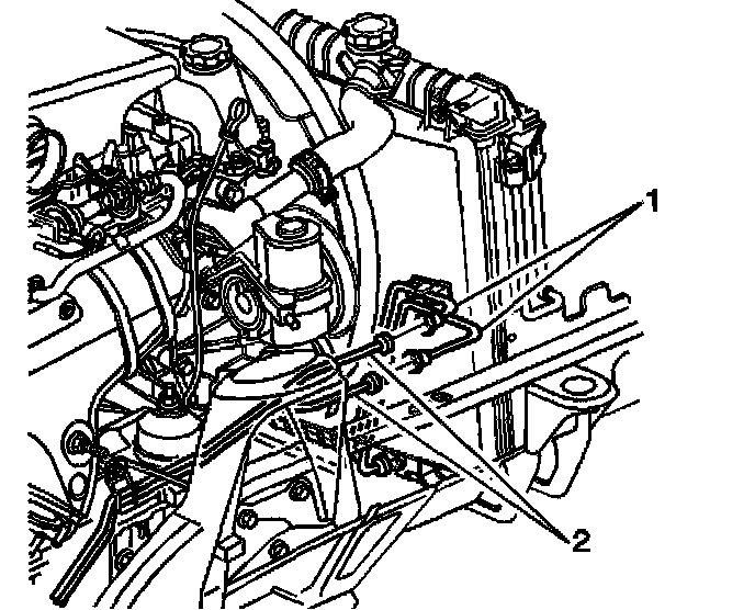 9. Remove the clip (2) that holds the cooler lines together.