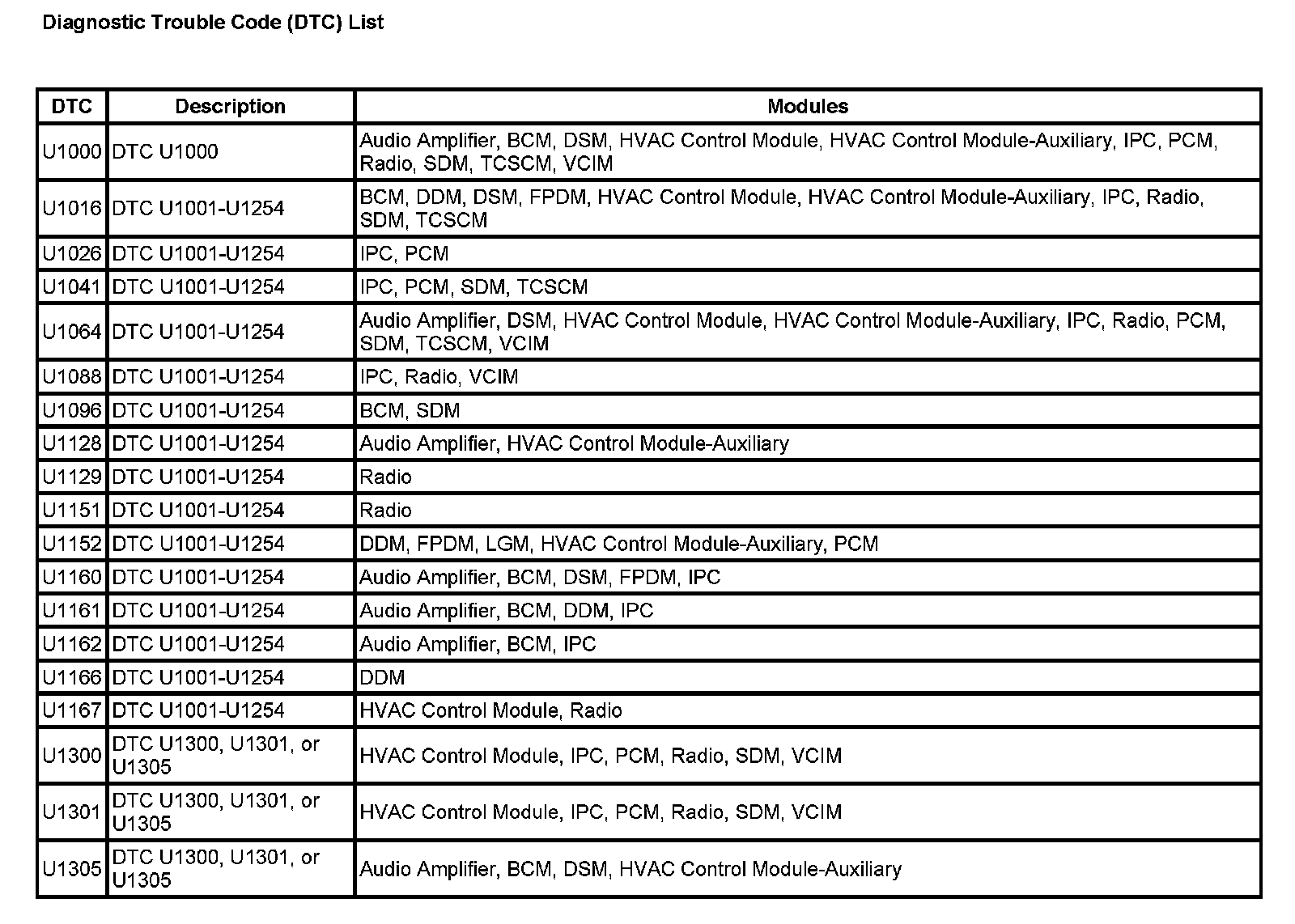DTCs U1000 - U1305: