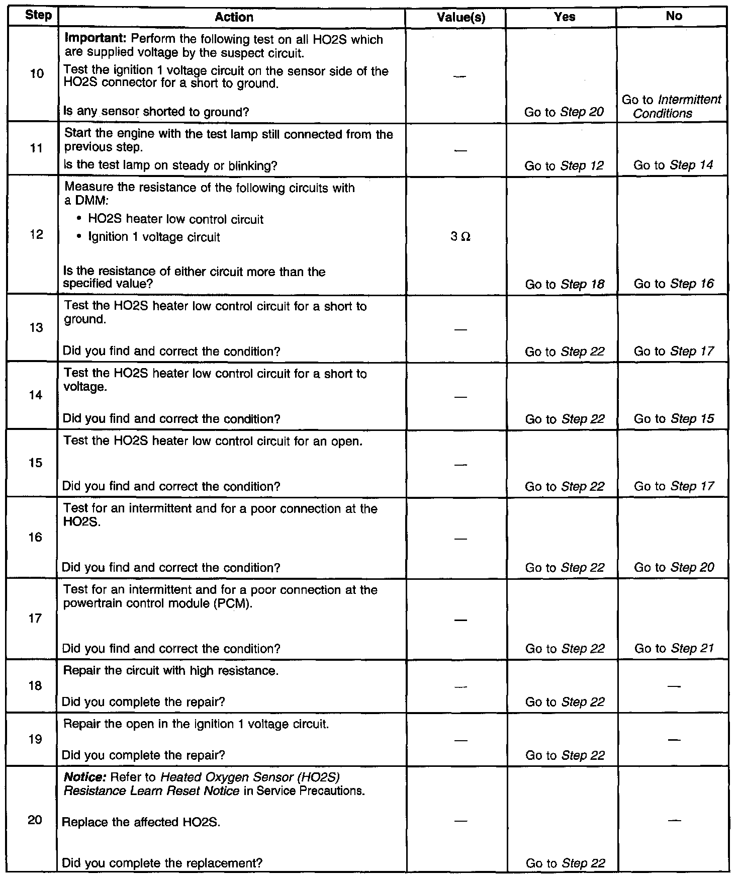Heated oxygen sensors (HO2S) are used for fuel control and post catalyst monitoring. Each HO2S compares the oxygen content of the surrounding air with the oxygen content in the exhaust stream. The HO2S must reach operating temperature to provide an accurate voltage signal. A heating element inside the HO2S minimizes the time required for the sensor to reach operating temperature. Voltage is provided to the heater by the ignition 1 voltage circuit through a fuse. With the engine running, ground is provided to the heater by the HO2S heater low control circuit, though a low side driver within the powertrain control module (PCM).