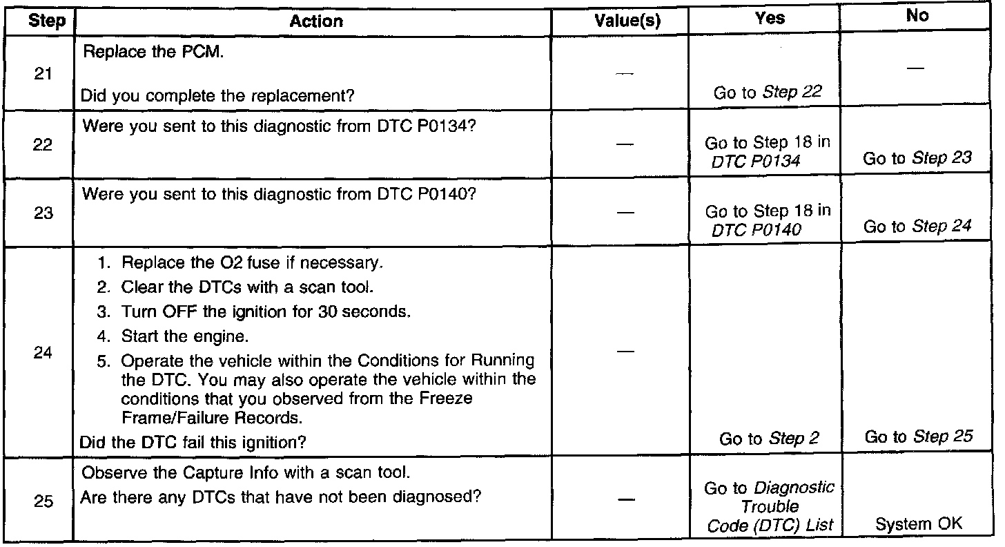 The PCM commands the heater ON or OFF to maintain a specific HO2S operating temperature range. The PCM determines the temperature by measuring the current flow through the heater and calculating the resistance. Based on the resistance of the PCM can predict the sensor temperature. HO2S 1 uses pulse width modulation (PWM) to control the heater operation. HO2S 2 simply uses ON/OFF commands to control the heater operation. For diagnosis the PCM monitor the heater current with the engine running. The PCM also calculates the heater resistance on a cold start. Both diagnostics will only run once per ignition cycle. If the PCM detects that the heater current or the heater calculated resistance is not within an expected range, DTC P0135 sets for HO2S 1 or DTC P0141 sets for HO2S 2.