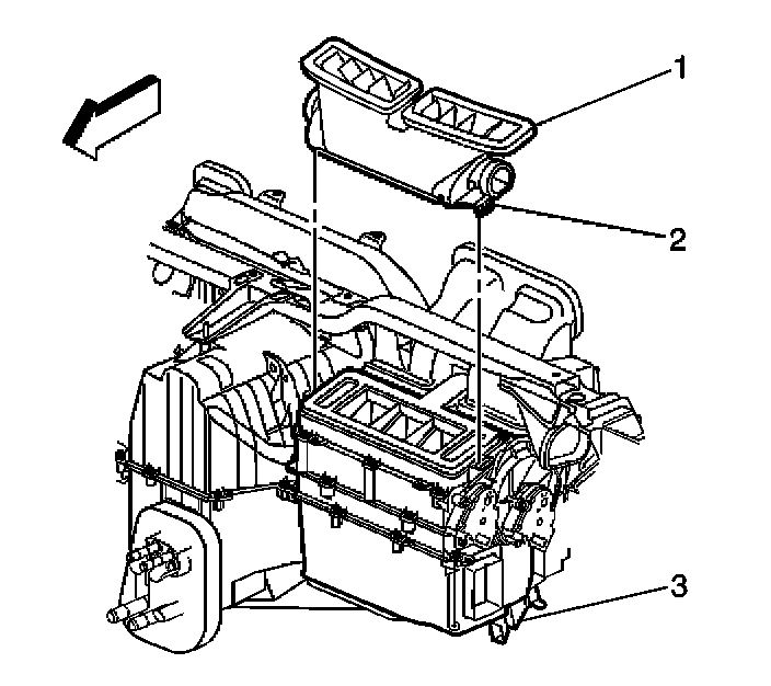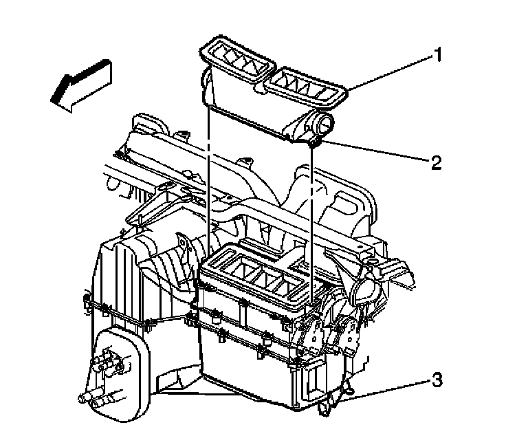 6. Release retaining clips (2) from the defroster duct (1).