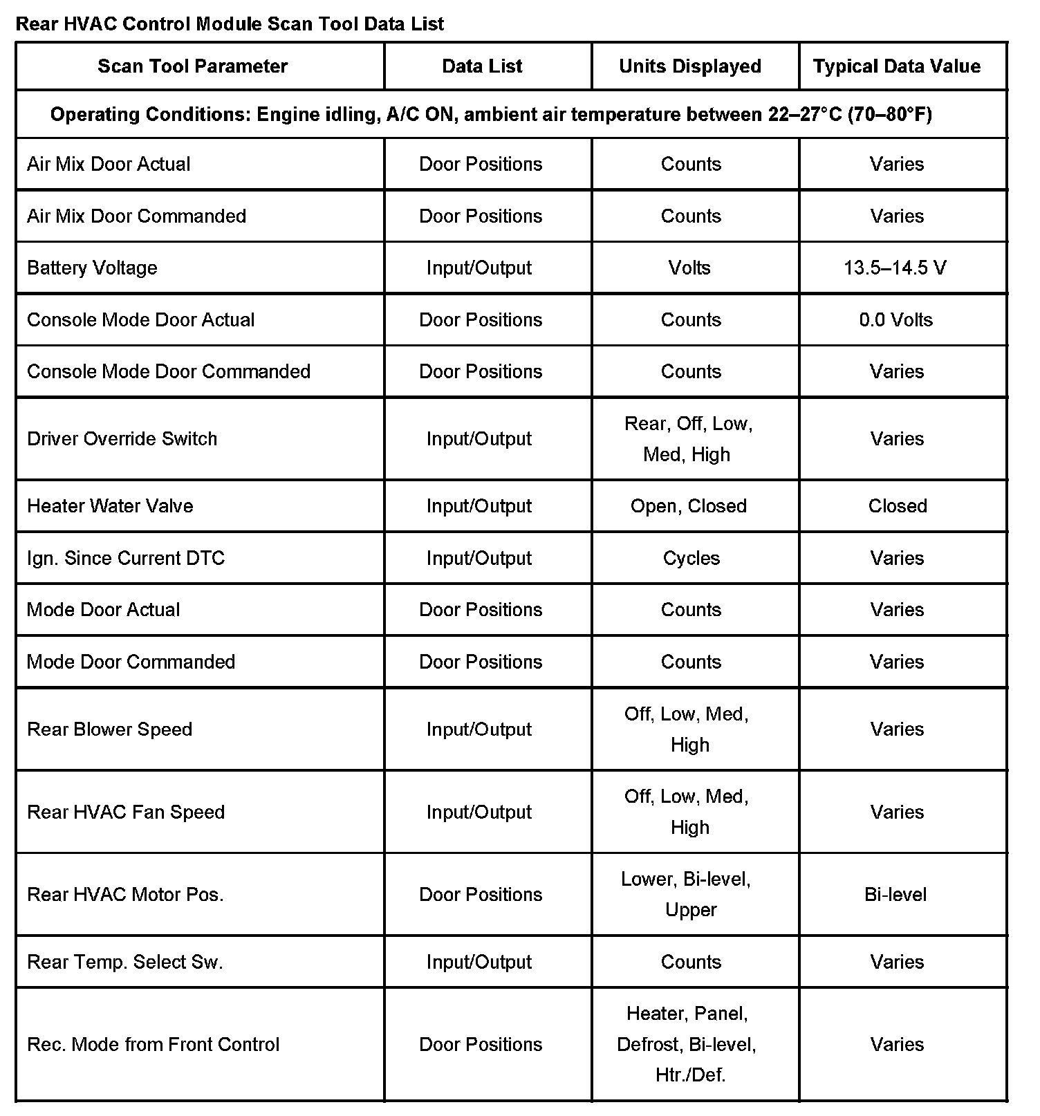Rear HVAC Control Module Scan Tool Data List: