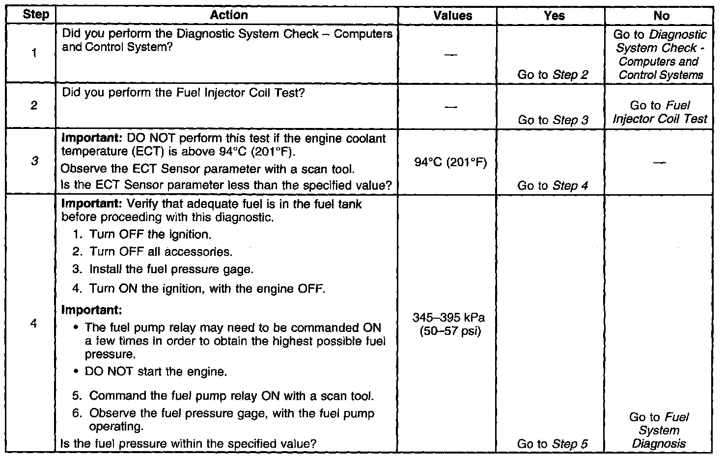 3. The engine coolant temperature (ECT) must be below the operating temperature in order to avoid irregular fuel pressure readings due to hot soak fuel boiling.