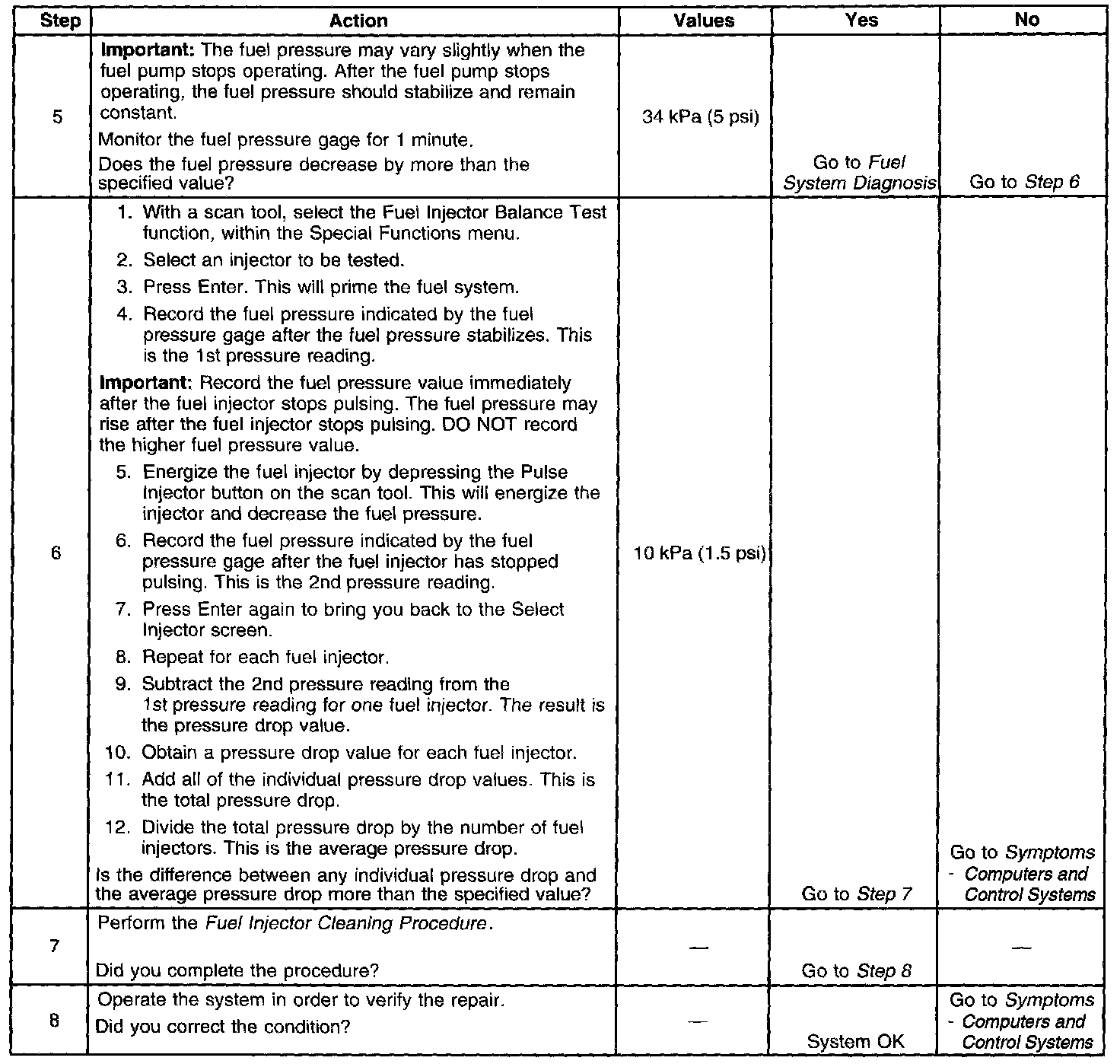 The scan tool is first used to energize the fuel pump relay. The scan tool is then used to pulse each injector for a precise amount of time allowing a measured amount of fuel into the manifold. This causes a drop in system fuel pressure that can be recorded and used to compare each injector.