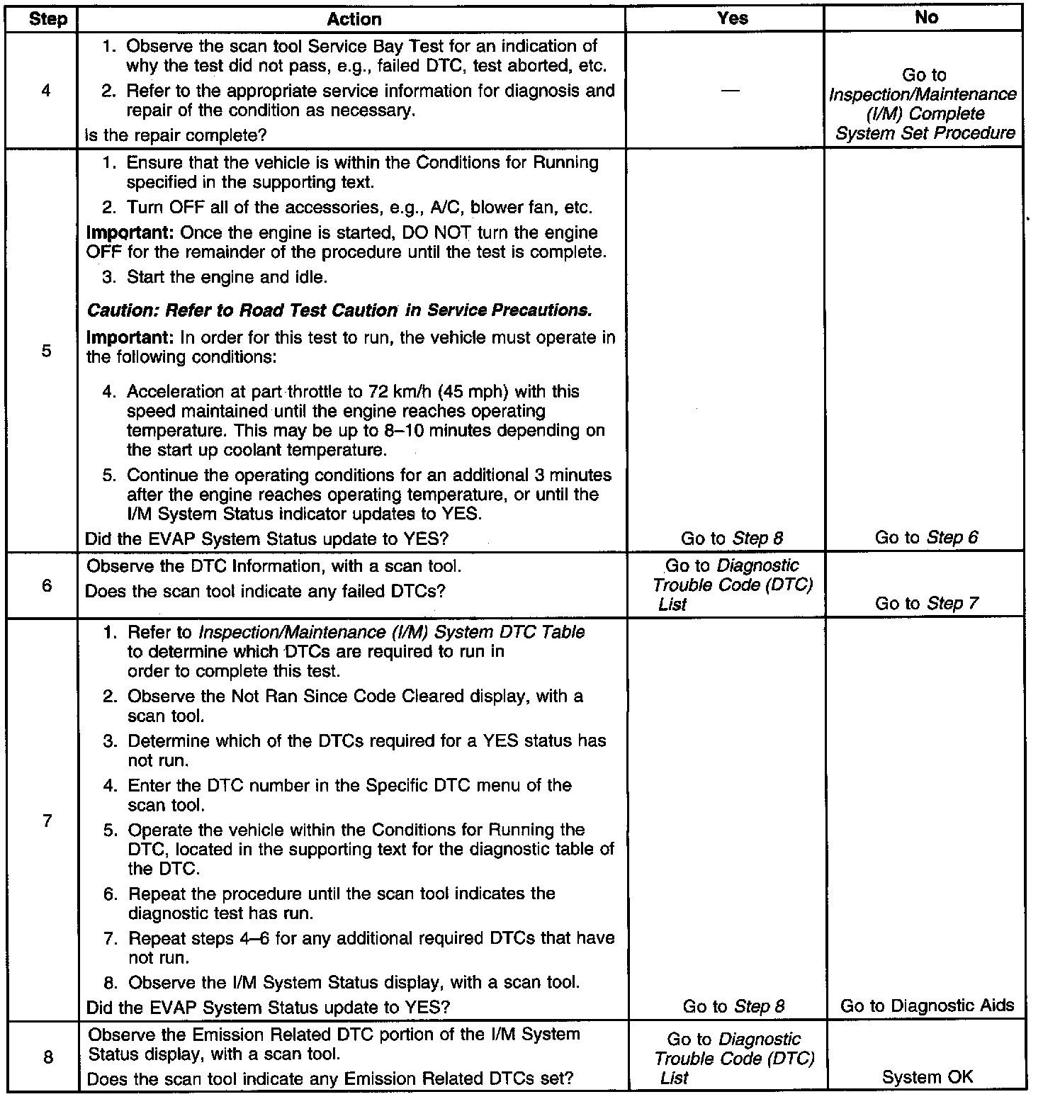 The first failure of a type B DTC does not constitute a final determination of pass or fail, and will not update the I/M System Status to YES. A second trip is required, and all the conditions to run must be met in order for the test to run again. These conditions may include a partial to complete engine cool down.