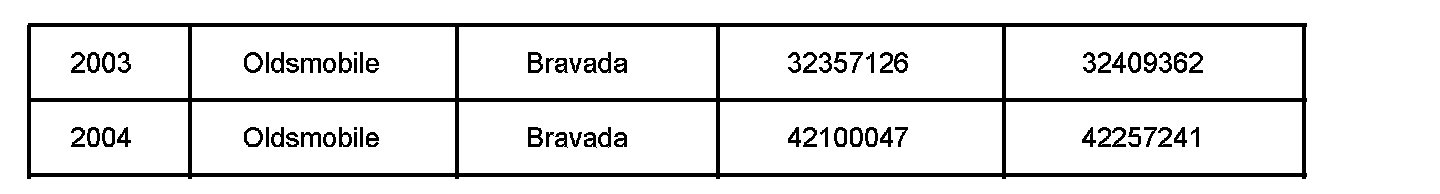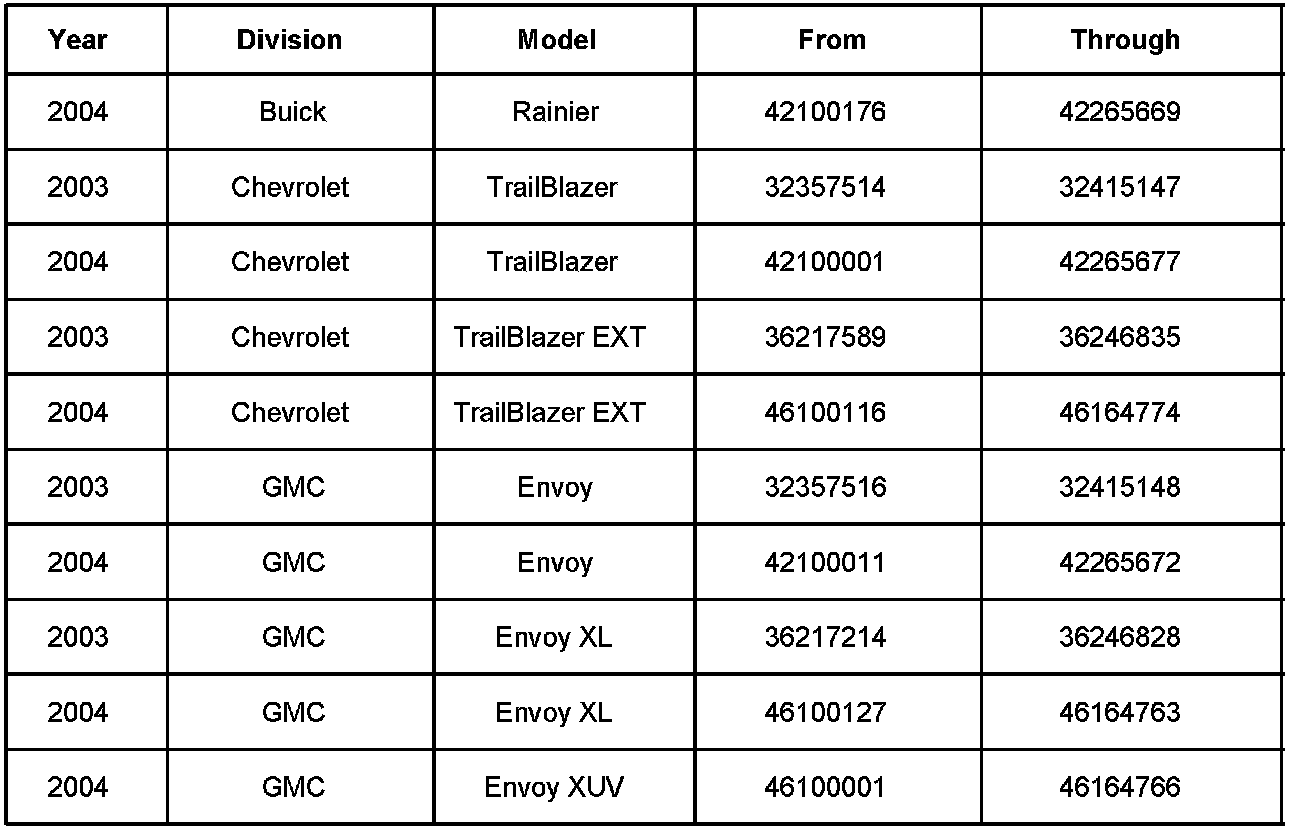 Involved are certain 2004 Buick Rainier, 2003-2004 Chevrolet TrailBlazer, GMC Envoy, and Oldsmobile Bravada vehicles built within the VIN breakpoints shown.