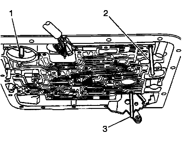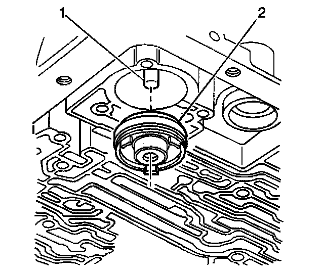3. Install the 3-4 accumulator piston (2) onto the pin (1) in the transmission case. Ensure that the 3-4 accumulator piston legs face away from the transmission case.