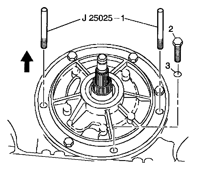 10. Install the remaining pump to case bolts (2) and O-ring seals (3), in the holes where the J 25025-1 were.
