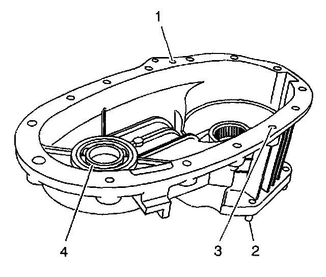 3. Inspect the input gear thrust bearing surface (2) and the clutch housing bearing surface (3) for the following: