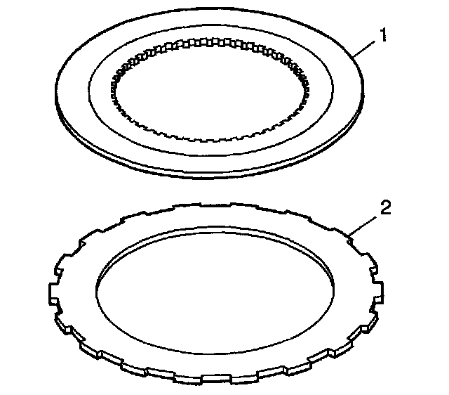 1. Do not clean the inner clutch discs (1) and outer clutch discs (2) in cleaning solvent.