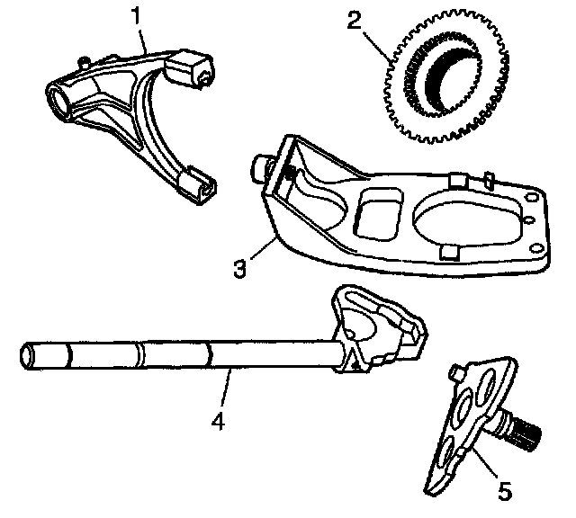1. Clean the following shift system components in cleaning solvent and air dry: The high/low shift fork (1) The range sleeve (2) The clutch lever (3) The shift fork shaft and shift detent lever (4) The control actuator lever shaft (5)