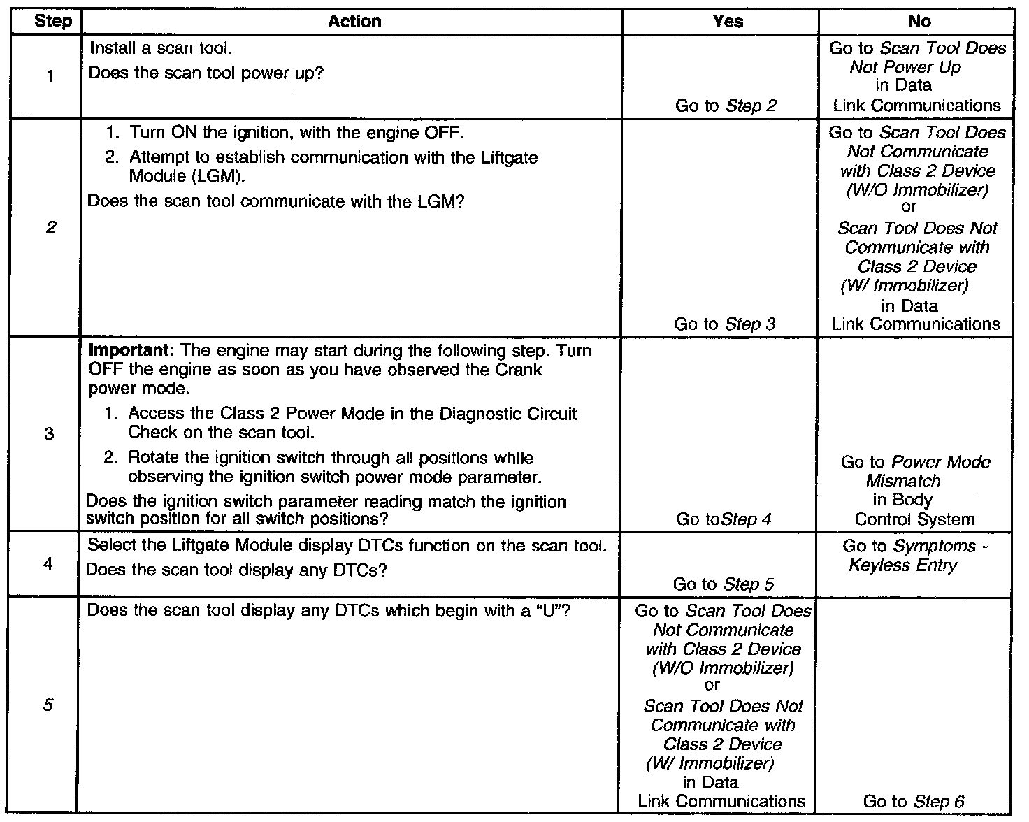 2. Lack of communication may be due to a partial malfunction of the class 2 serial data circuit or due to a total malfunction of the class 2 serial data circuit. The specified procedure will determine the particular condition.