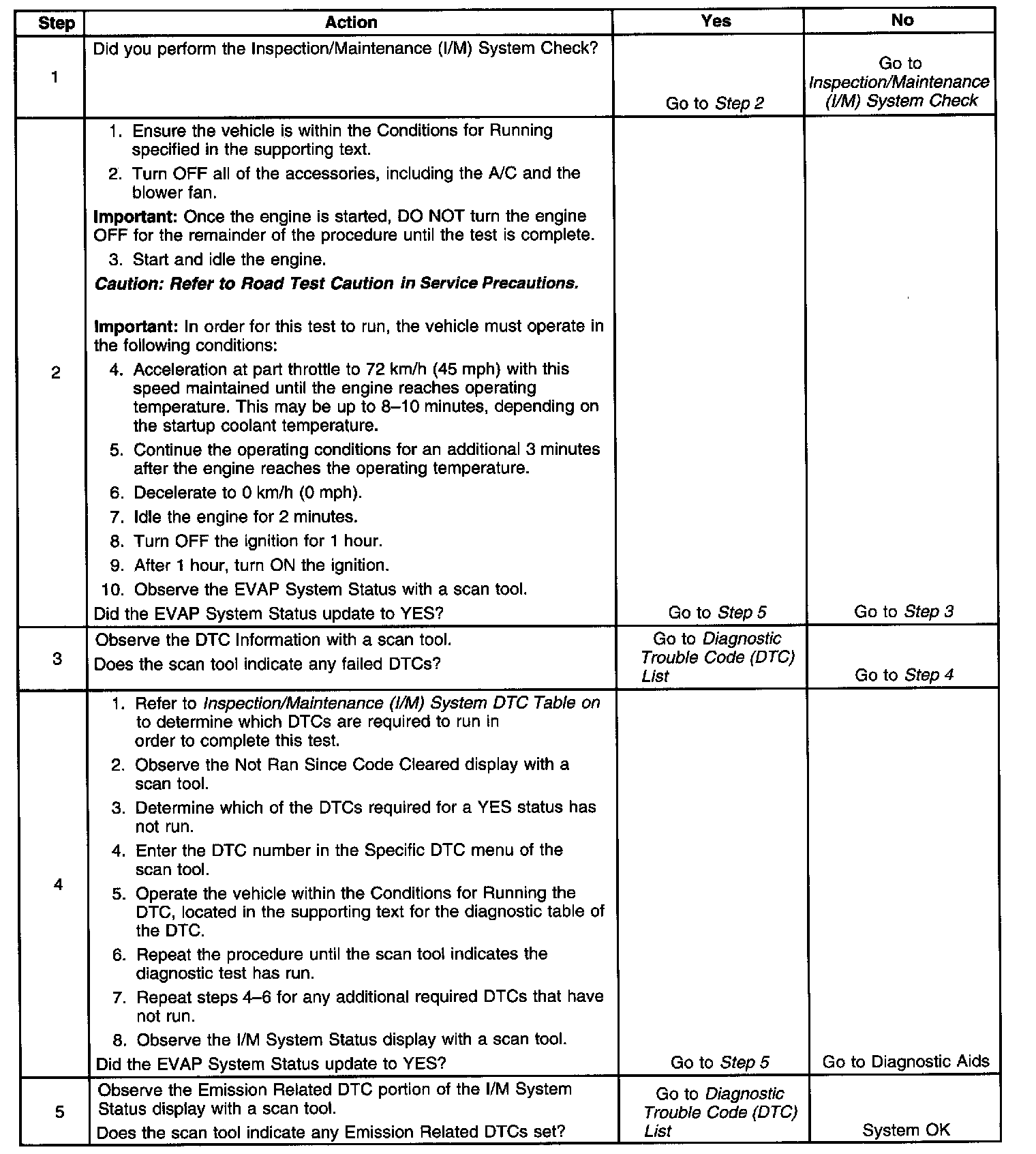 The purpose of this test is to satisfy the enable criteria necessary in order to execute the inspection/maintenance (I/M) readiness diagnostics for the evaporative emission (EVAP) system. The test may be used in order to set the I/M System Status indicators to YES. The I/M System Status Display on the scan tool provides an indication of when the control module has completed the required tests. The I/M System Status does not indicate that the tests have passed or failed. When all of the diagnostics for a specific system have run and passed and I/M System Status will update to YES. If a test for a specific system has failed, the I/M System Status will update to YES, indicating a determination was made, even if all of the other tests for that system have not run. Performing a visual inspection prior to running the EVAP test may prevent having to repeat the test. A failed or aborted test will require the vehicle to cool down in order to meet the enable criteria to run another test.