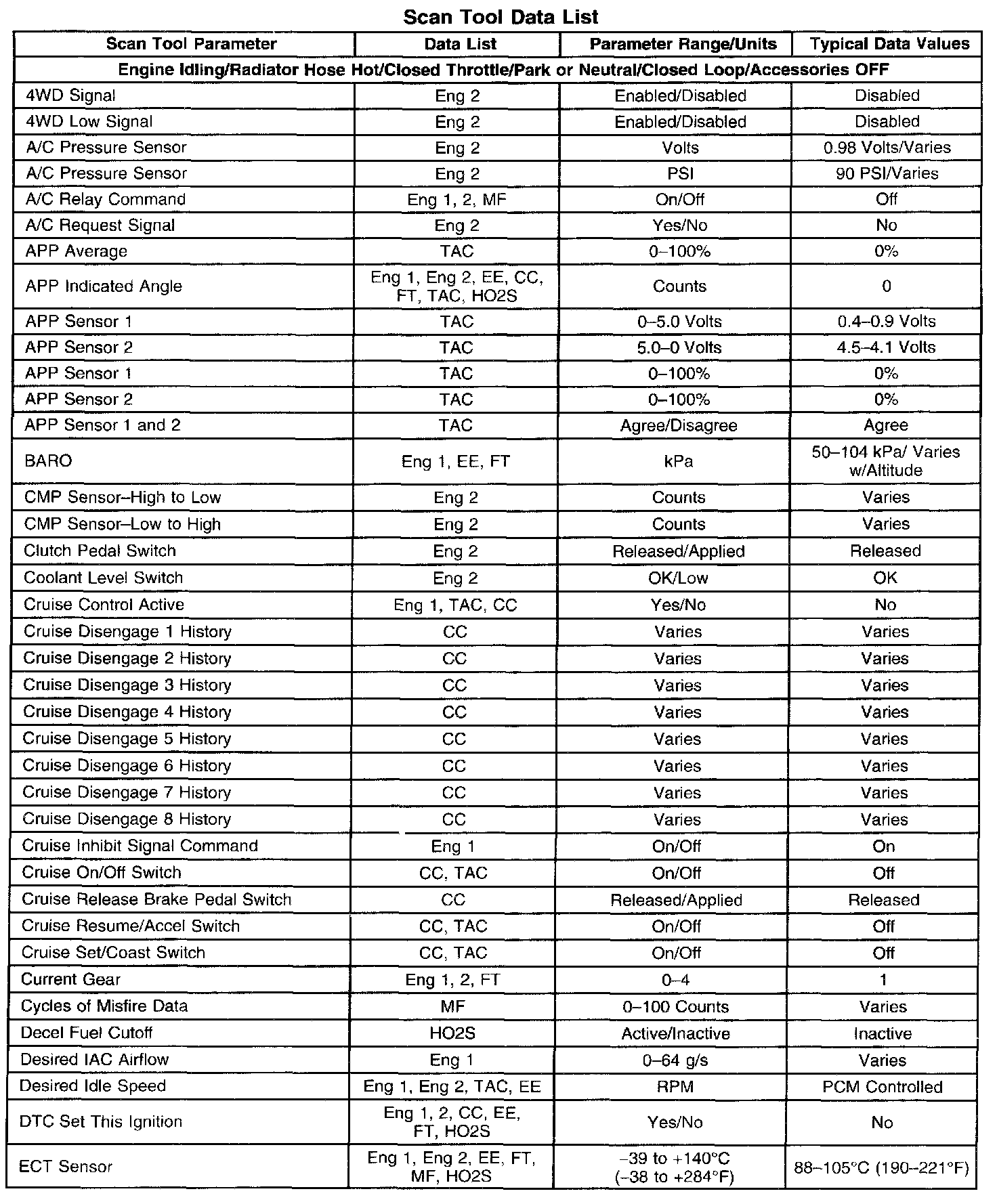 The Engine Scan Tool Data List contains all engine related parameters that are available on the scan tool. The list is arranged in alphabetical order. A given parameter may appear in any one of the data lists, and in some cases may appear more than once, or in more than one data list in order to group certain related parameters together.