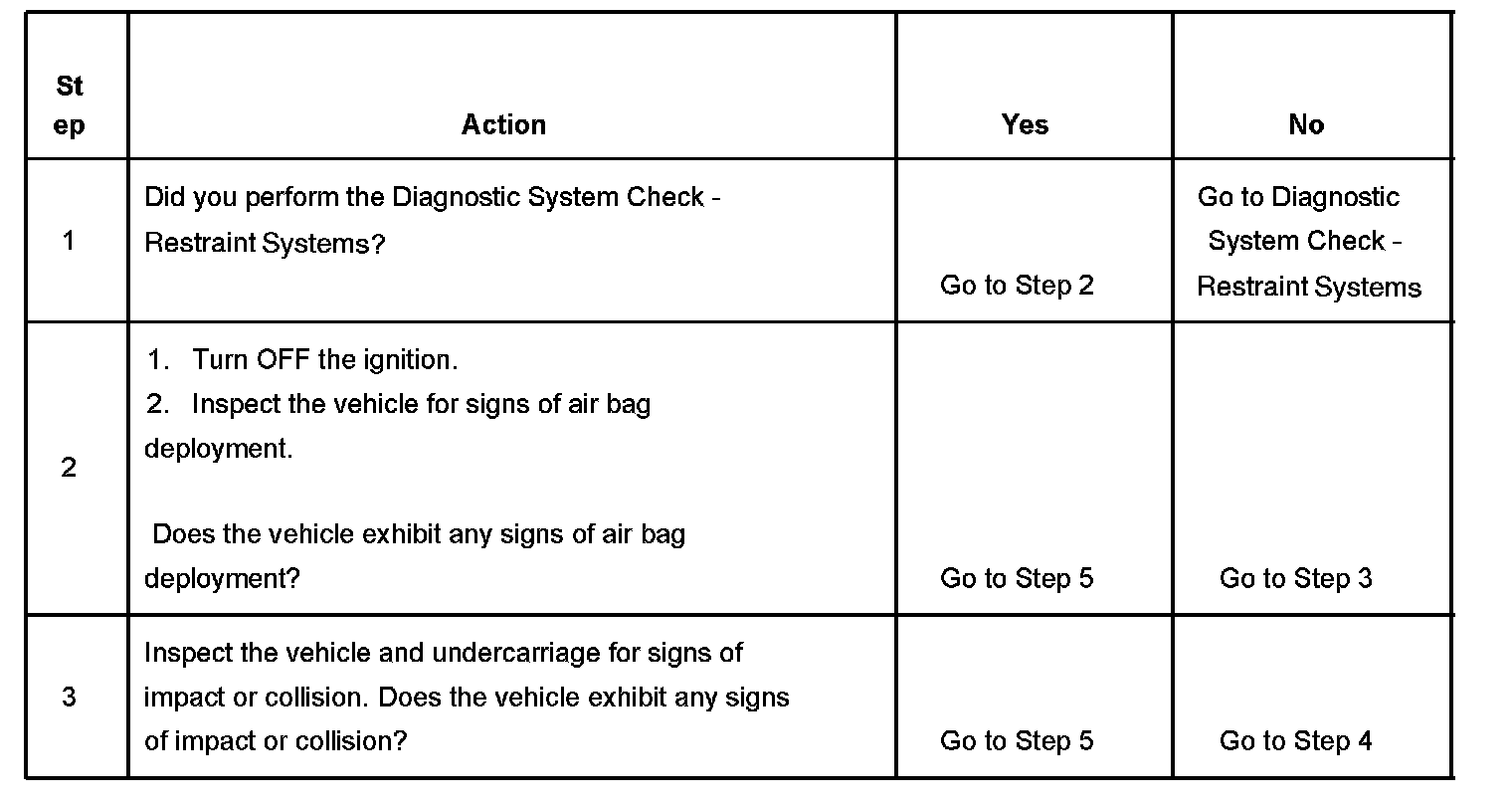 The inflatable restraint sensing and diagnostic module (SDM) contains a sensing device that converts changes in vehicle velocity to an electrical signal. The SDM compares this signal to a value stored in memory. When the generated signal exceeds the stored value, the SDM performs additional signal processing and compares the generated signals to values stored in memory. When two of the generated signals exceed the stored values, the SDM will cause current to flow through the inflator modules, deploying the air bags. DTC B0053 will set instead of DTC B0051 when a deployment occurs while an inflator circuit fault is present that may result in a non-deployment situation in one or more of the inflator modules.