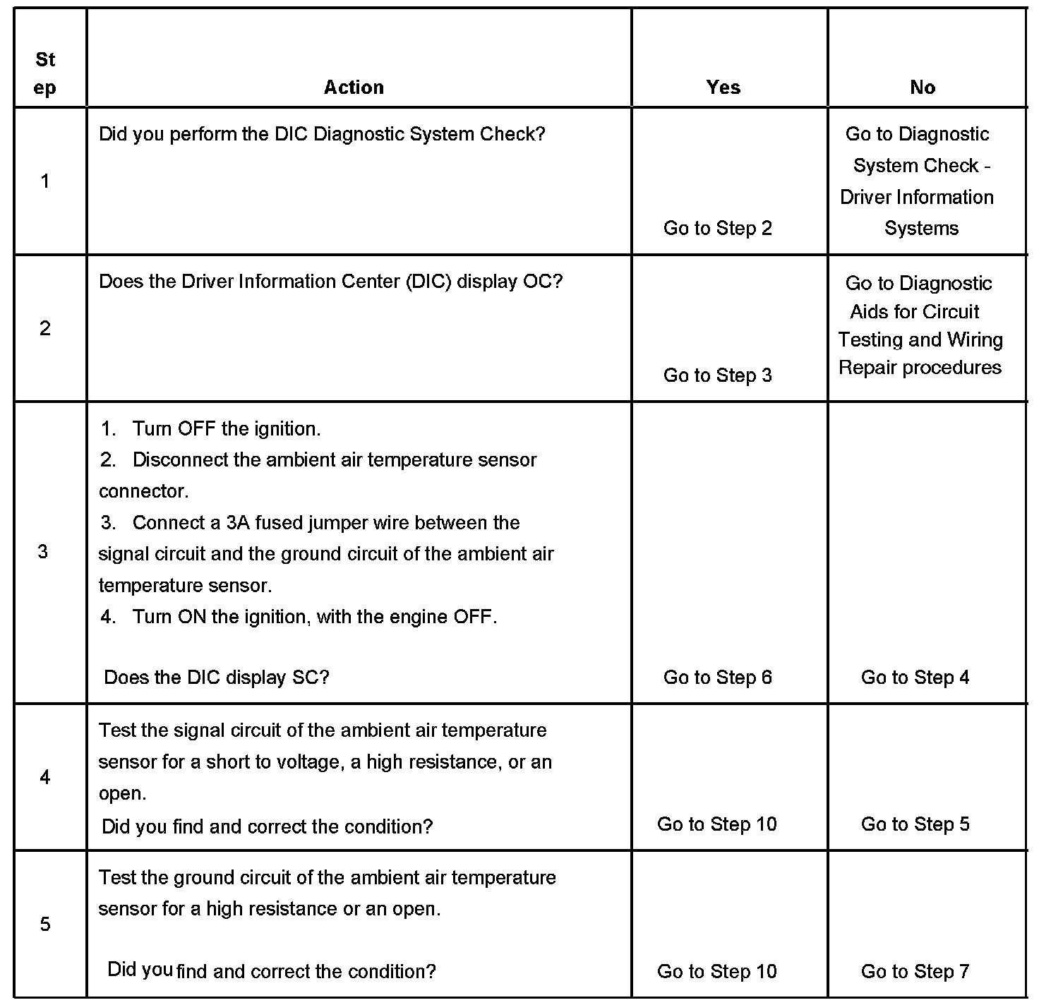 The driver information center (DIC) applies 5 volts to the ambient air temperature sensor. The ambient air temperature sensor is a thermistor which will vary in resistance with temperature change. As the resistance of the ambient air temperature sensor increases, the DIC senses a larger voltage drop across the sensor, indicating a lower temperature. As the resistance of the ambient air temperature sensor decreases, the DIC senses a small voltage drop across the sensor, indicating a higher temperature.