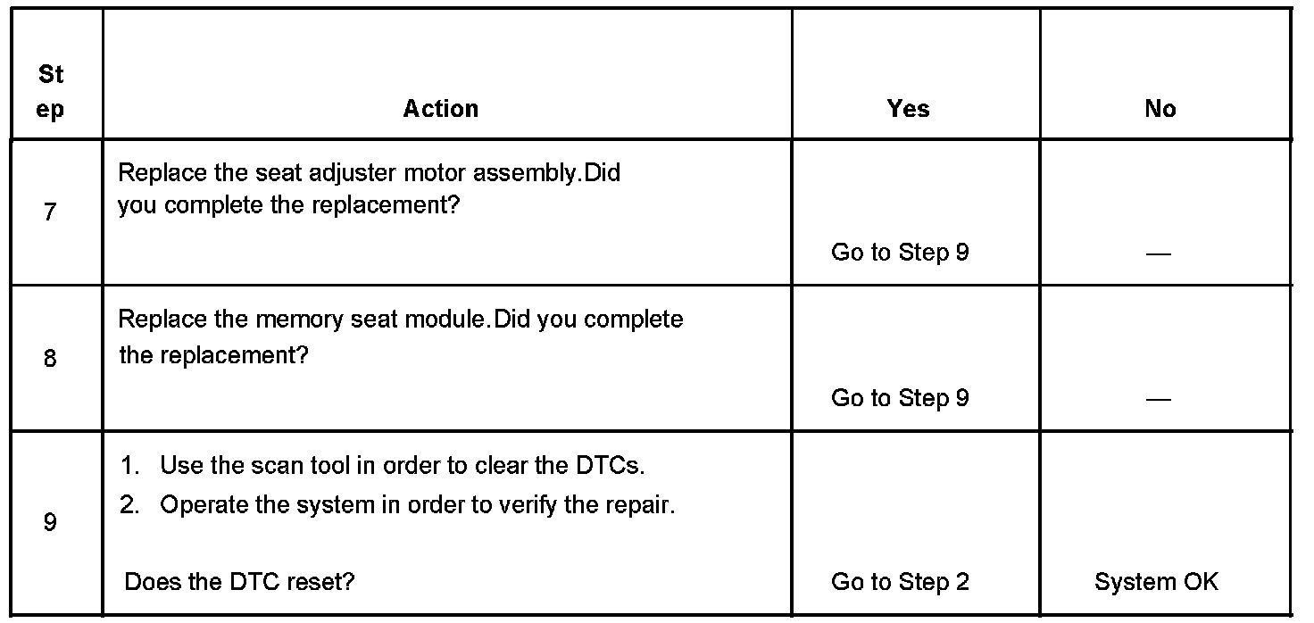 - The memory seat module will disable the seat adjuster motor for which a current status DTC is set.