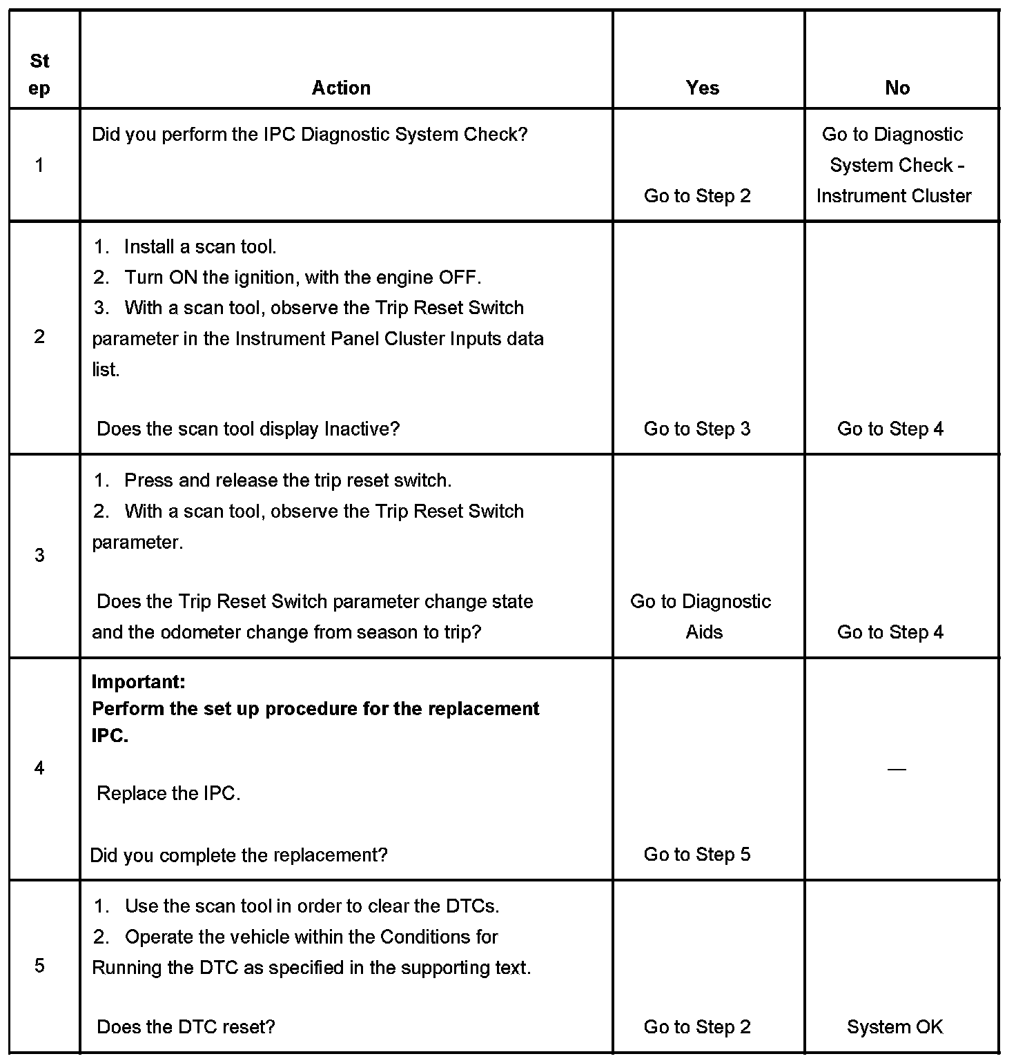 The instrument panel cluster (IPC) contains a momentary switch that controls the trip odometer reset and trip season display options. The IPC monitors the circuit voltage levels and detects when the trip odometer reset switch has been depressed.