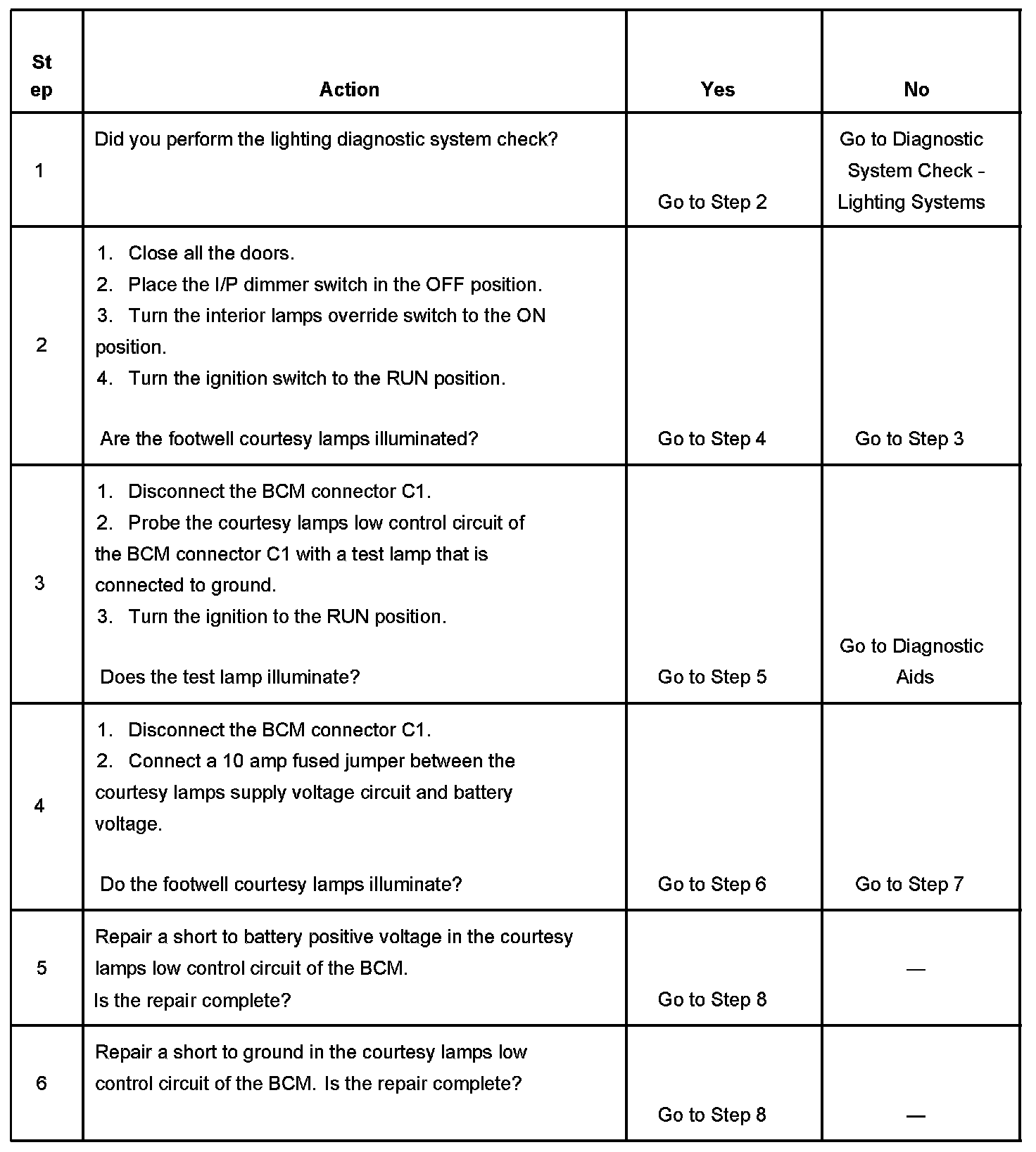 - A short to battery positive voltage in the courtesy lamps low control circuit is no longer present between the BCM and any of the courtesy lamps.