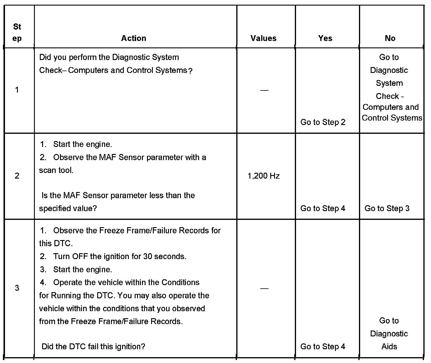 The PCM detects that the MAF sensor frequency signal is less than 1,200 Hz.