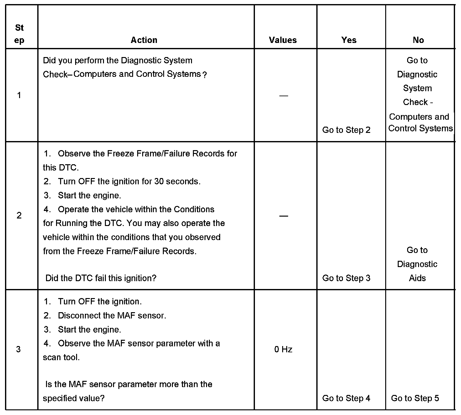 3. This step tests for Electromagnetic Interference (EMI) on the signal circuit of the MAF sensor. A frequency reading with the MAF sensor disconnected may indicate an EMI related fault or a poor connection at the PCM. Disconnecting the MAF sensor may set additional related DTCs.