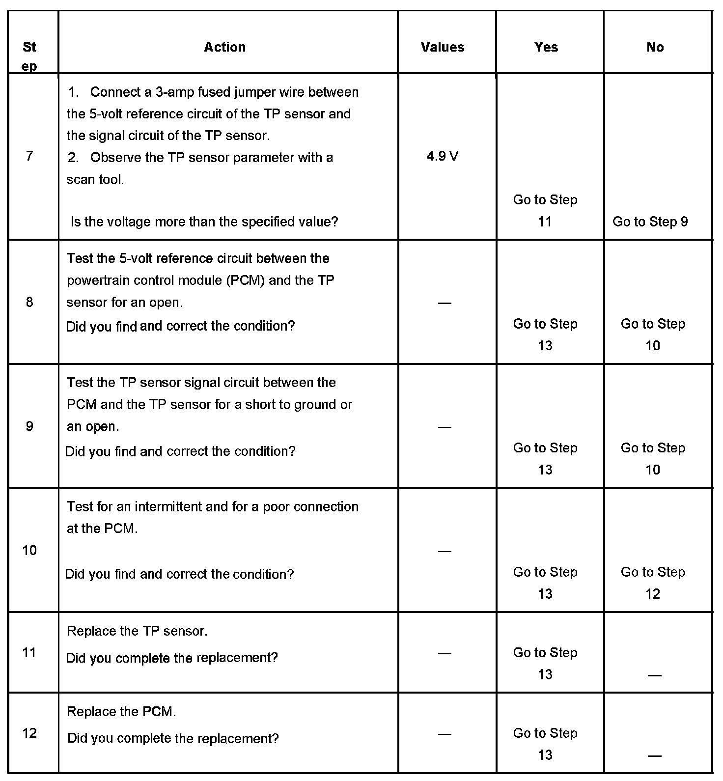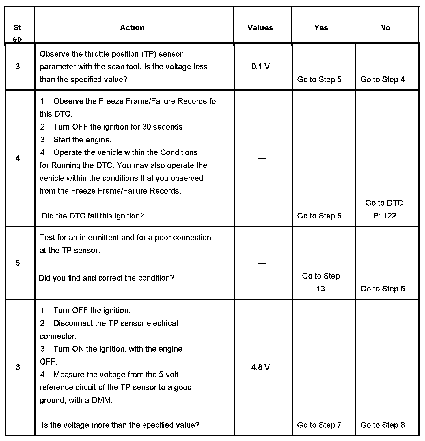 The PCM provides the TP sensor with 5 volts on the 5-volt reference circuit and a ground on the low reference circuit. Rotation of the TP sensor rotor from the closed throttle position to the wide open throttle (WOT) position provides the PCM with a signal voltage from less than 1.0 volt to greater than 4.0 volts through the TP sensor signal circuit. If the PCM detects an excessively low signal voltage, DTC P0122 sets.