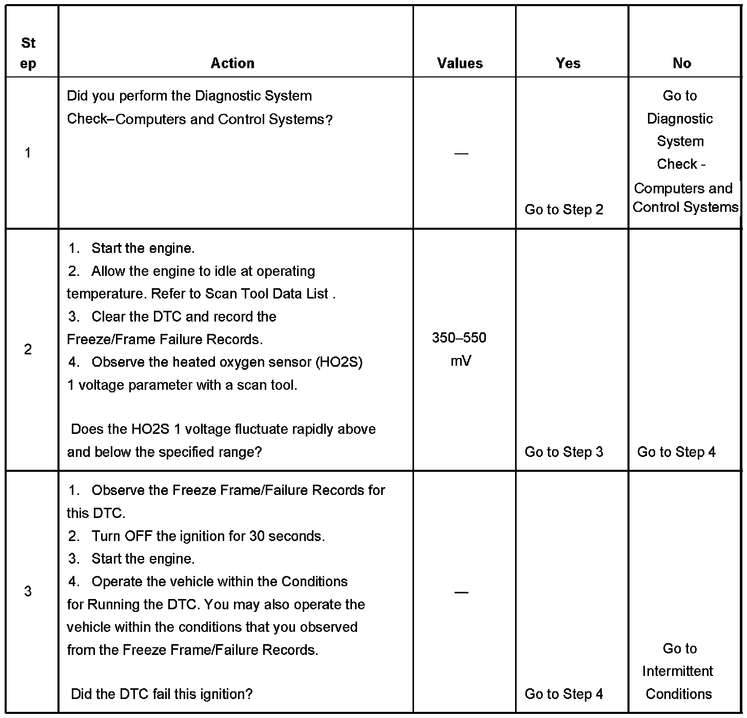 Heated oxygen sensors (HO2S) are used for fuel control and post catalyst monitoring. Each HO2S compares the oxygen content of the surrounding air with the oxygen content of the exhaust stream. When the vehicle is first started, the powertrain control module (PCM) operates in an Open Loop mode, ignoring the HO2S signal voltage when calculating the air-to-fuel ratio. The PCM supplies the HO2S with a reference, or bias, voltage of about 450 mV. The HO2S generates a voltage within a range of 0-1,000 mV that fluctuates above and below bias voltage once in Closed Loop. A high HO2S voltage output indicates a rich fuel mixture. A low HO2S voltage output indicates a lean mixture. Heating elements inside the HO2S minimize the time required for the sensors to reach operating temperature, and to provide an accurate voltage signal. If the PCM detects an active HO2S 1 signal of a lower than calibrated minimum amplitude, DTC P0130 will set.