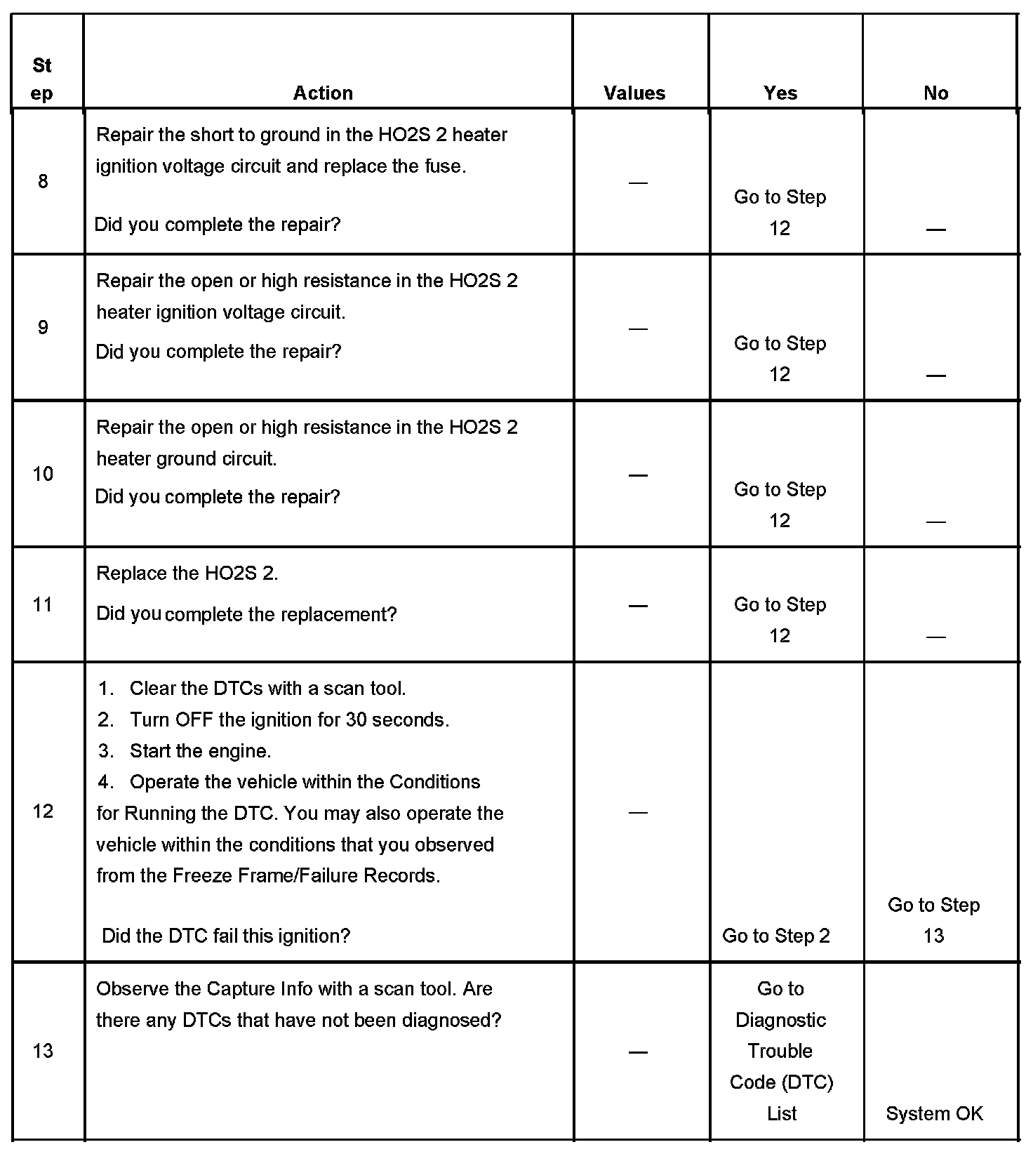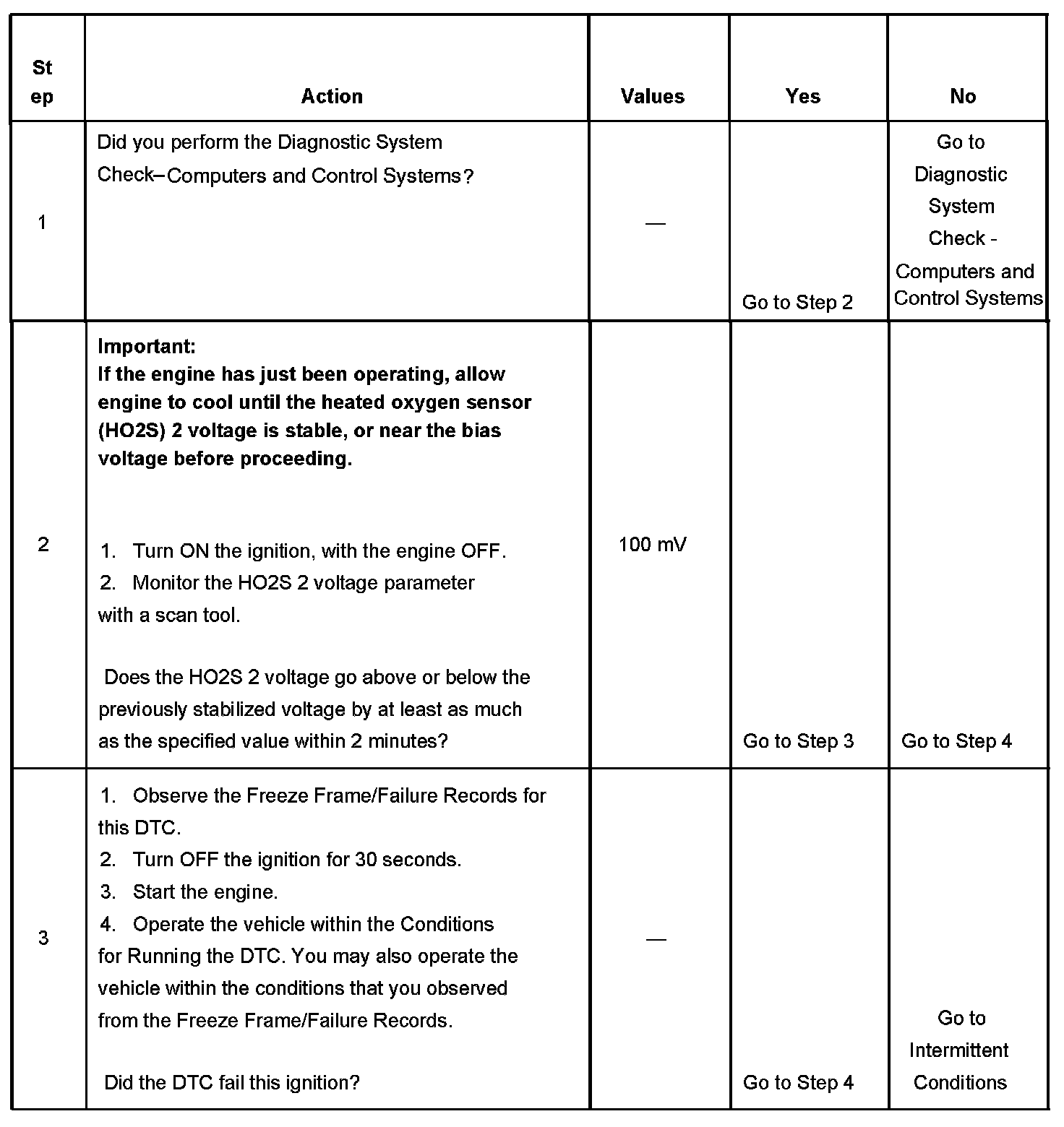 The PCM detects that the HO2S 2 voltage remains within 74 mV of the bias voltage, about 450 mV, for a longer amount of time than necessary. The amount of time ranges between 100-280 seconds depending on ECT at start-up, and the average mass air flow (MAF) since start-up.