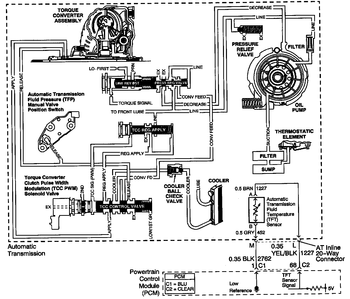 Hot fluid from the torque converter flows through the TCC control valve into the cooler lines to the oil cooler located in the vehicle radiator and auxiliary cooler, if equipped. Cool fluid then returns to lubricate the final drive assembly and other components along the output shaft.