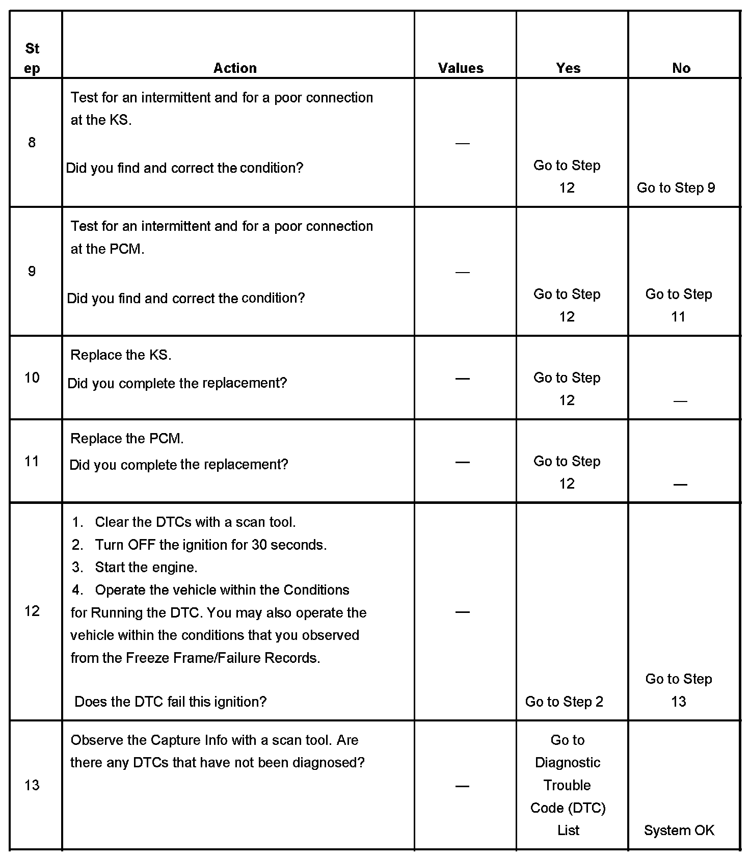 The knock sensor (KS) system enables the powertrain control module (PCM) to control the ignition timing for the best possible performance while protecting the engine from potentially damaging levels of detonation. The KS is located at the left side of the engine block. The KS produces an AC voltage that varies depending on the vibration level during engine operation. The PCM adjusts the spark timing based on the amplitude and the frequency of the KS signal. The PCM receives the KS signal through a signal circuit. The KS ground is supplied by the engine block through the sensor housing. The PCM uses the KS signal to calculate an average voltage range value. If the system is operating normally, the PCM should monitor the KS voltage varying above and below the voltage range. If the PCM detects the KS signal voltage within the voltage range, or the KS signal is not present, this DTC will set.